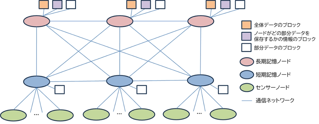 - トレーサビリティー用BCには、長期記憶ノード・短期記憶ノード・センサーノードから構成される階層構造を採用。価値変換装置に設置された小型BCサーバー(センサーノード)から送信される膨大な計測データを、複数の短期記憶ノードで分担保存することで、高速処理を実現。その後、長期記憶ノードが部分データを統合し、全体データのブロックとして保存することにより、改ざんが極めて困難な形での膨大な計測データの保存を実現(図2)