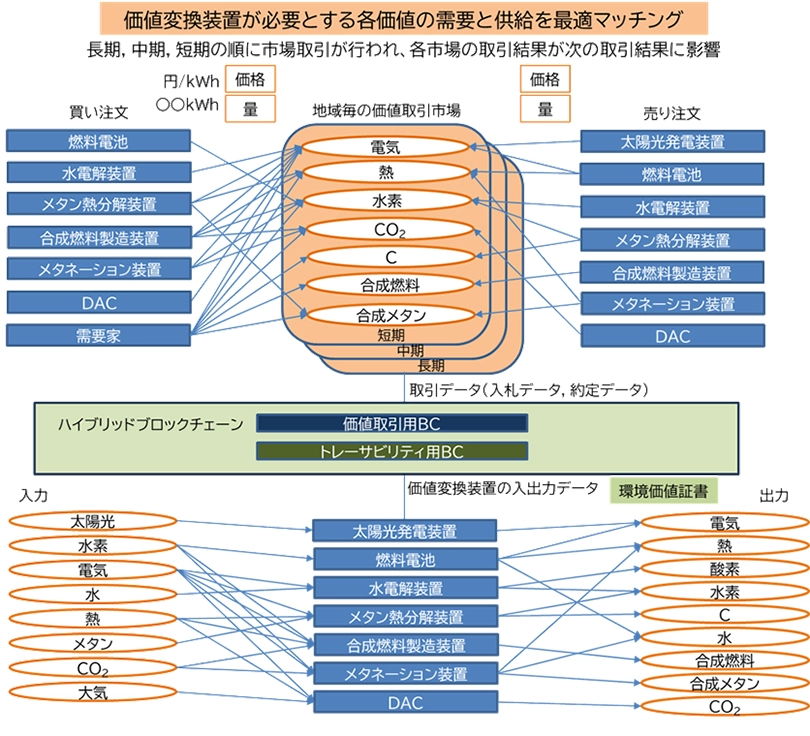 ・電力・熱・化学物質間の変換価値の可視化技術、取引技術、取引履歴の分散管理技術の研究 ・アルゴリズムの研究・評価、ユースケースの検討 |