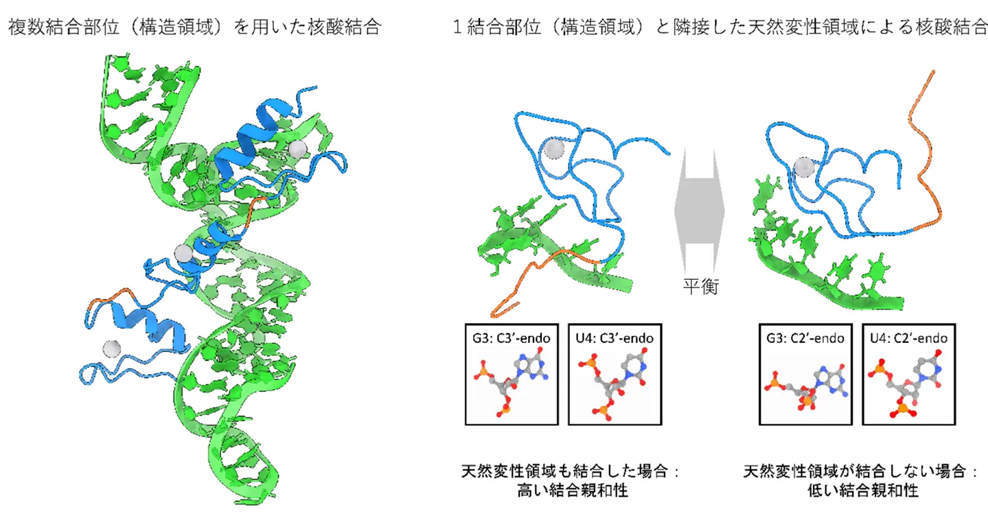 生命現象を包括的に理解するために、細胞内でタンパク質がRNAやDNAなどの核酸の特定の塩基配列をどのように認識しているかを解明することは重要です。核酸を認識するタンパク質の多くは、天然状態で立体構造が安定した「構造領域[用語1]」と柔軟性の高い「天然変性領域(IDR)[用語2]」の両方を含みますが、これらがどのように協調して核酸と結合しているのかは、これまで十分に明らかにされていませんでした。