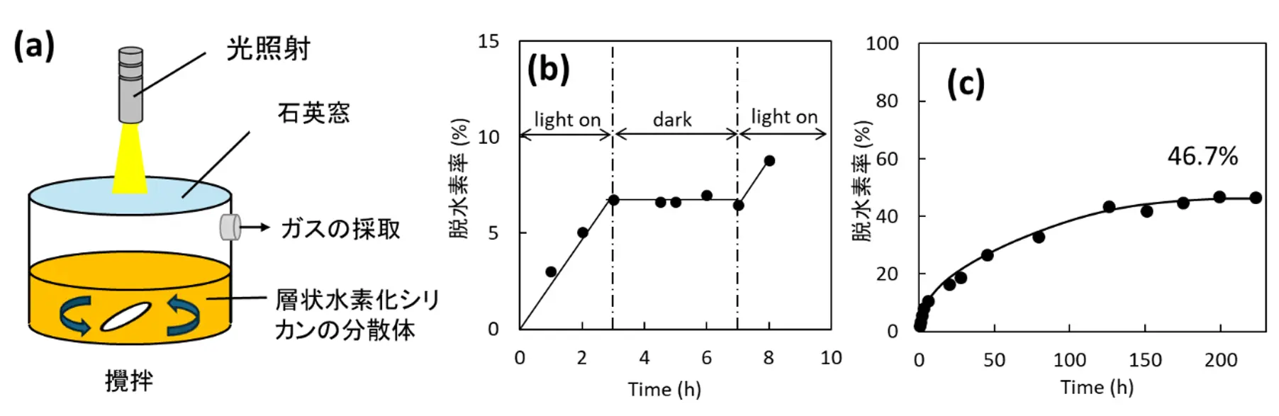 一方、水素とケイ素が1対1で結合した層状物質である層状水素化シリカン(HSi)は、比較的高い質量水素密度(3.44%)を持つものの、これまでは主に電子材料や電池材料としての応用研究が中心でした。今回の研究では、層状水素化シリカンを水素キャリアとして活用する上で重要な「光による脱水素プロセス」に着目し、詳細に評価しました。