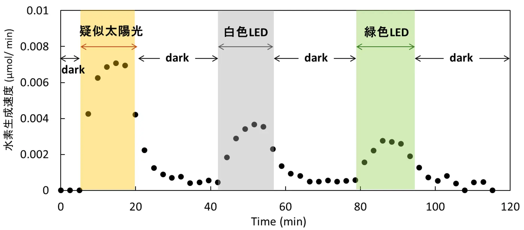 - 常温・常圧下での太陽光やLEDなどの可視光照射で水素放出が生じることを確認。