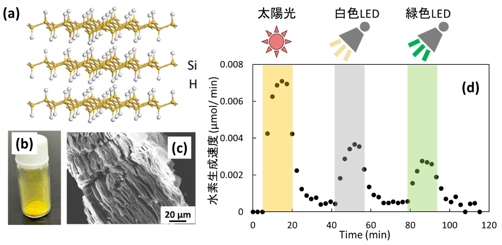 - 比較的高い質量水素密度を持つ層状水素化シリカンから可視光の照射だけで水素を取り出せることに成功。