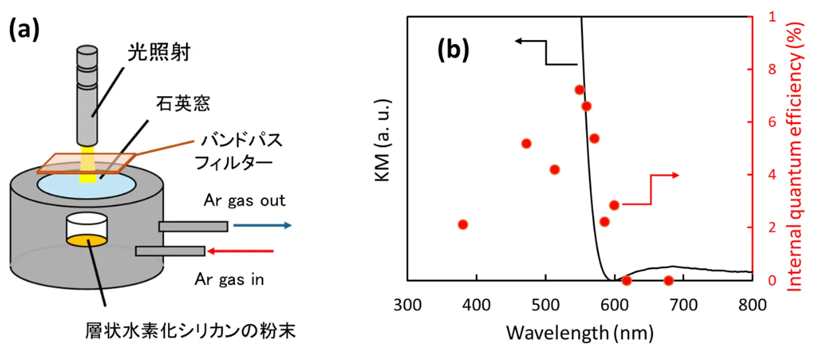 次に、層状水素化シリカンに光を照射した際の水素放出特性を評価しました。気相流通系での水素放出評価方法(図3(a))を用いて、水素放出の内部量子収率[用語8]の作用スペクトル[用語9]を計測したところ、層状水素化シリカンは 600 nm 以下の可視光照射によって水素を放出できることが明らかになりました(図3(b))。特に、太陽光スペクトルの中で強度が最も強い波長域である550 nmでは、水素放出の内部量子収率は7.3%に達しました。