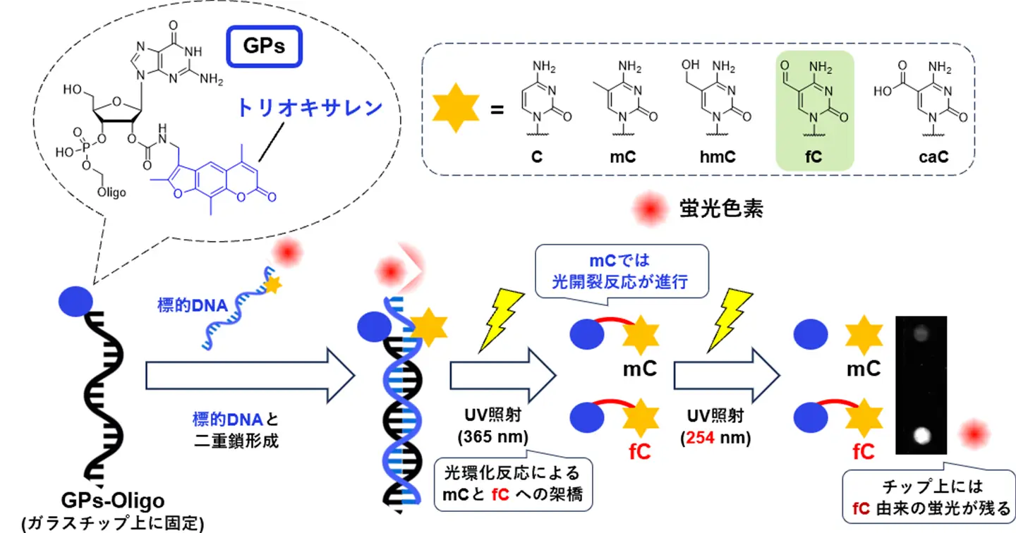 研究チームは、光反応を利用した分子プローブに着目し、外部刺激によって反応を制御できる特長を活かした分子設計を検討しました。その結果、開発した「GPs-Oligo」は、紫外光照射により5fCと特異的に架橋反応を起こし、他のシトシン修飾とは異なる挙動を示すことが明らかになりました。さらに、本分子を用いたDNAチップを構築し、5fCを識別できる遺伝子診断チップへ展開する技術基盤を構築しました(図1)。