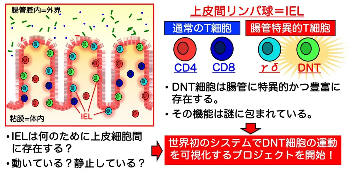 本研究チームは、IELの中でも腸管に豊富に存在しながら、その機能が未解明であったT細胞分画であるDNT細胞の動態を可視化する研究プロジェクトを発案しました(図1)。