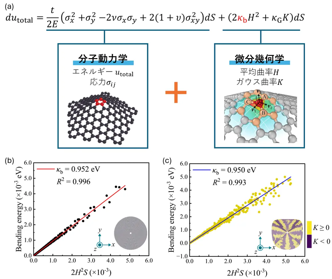 本研究では、ナノ炭素材料の曲げ剛性の実験的評価における技術的困難を克服するため、新規な数理解析アプローチを初めて提案しました。具体的には、分子動力学シミュレーションと、微分幾何学に基づくヘルフリッヒ膜理論を融合し、ナノスケールにおけるGSの曲げ剛性を精度よく評価可能な新たな数理手法の開発に成功しました(図2(a))。