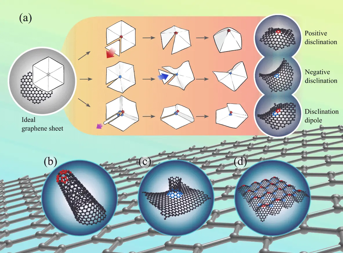グラフェンシート(GS)は、卓越した柔軟性と力学特性を兼ね備えた二次元ナノ炭素材料として注目されています。回位は回転型の格子欠陥であり、局所的な自発曲率を持つため、GSをはじめとした材料の曲げ剛性に対して顕著な影響を及ぼすことが知られています。回位の曲面維持の機能性を活用することにより、ナノスケール材料の新構造や新機能の創出が可能だと考えられています(図1)。しかしながら、実験的手法では、ナノスケールでの精密な変形計測や境界条件の厳密な制御が極めて困難であり、曲げ剛性を正確に評価することが難しく、技術的課題となっています。また、回位を導入したナノ炭素材料においては、形状変化とそれに伴う力学特性発現に関する理論的な理解が未だ不十分であり、明確な理論的ギャップが存在していました。このような課題を克服し、ナノスケール材料の新機能開発や産業への応用を推進するためには、新たな数理的アプローチの構築が必要不可欠でした。