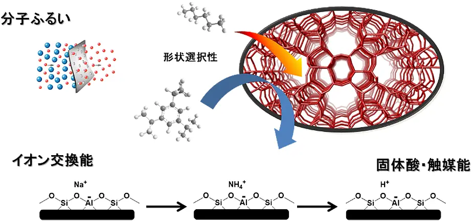 - ゼオライト:アルミノケイ酸塩の総称。多孔質結晶構造を持ち、分子ふるい効果や固体酸性、イオン交換能などの特性を示す。非常に多彩な骨格構造を持ち、それぞれにアルファベット3文字の骨格コードが割り当てられている。今回用いたBeta、CON型, MFI型およびFAU型ゼオライトは全て異なる骨格構造を有している。