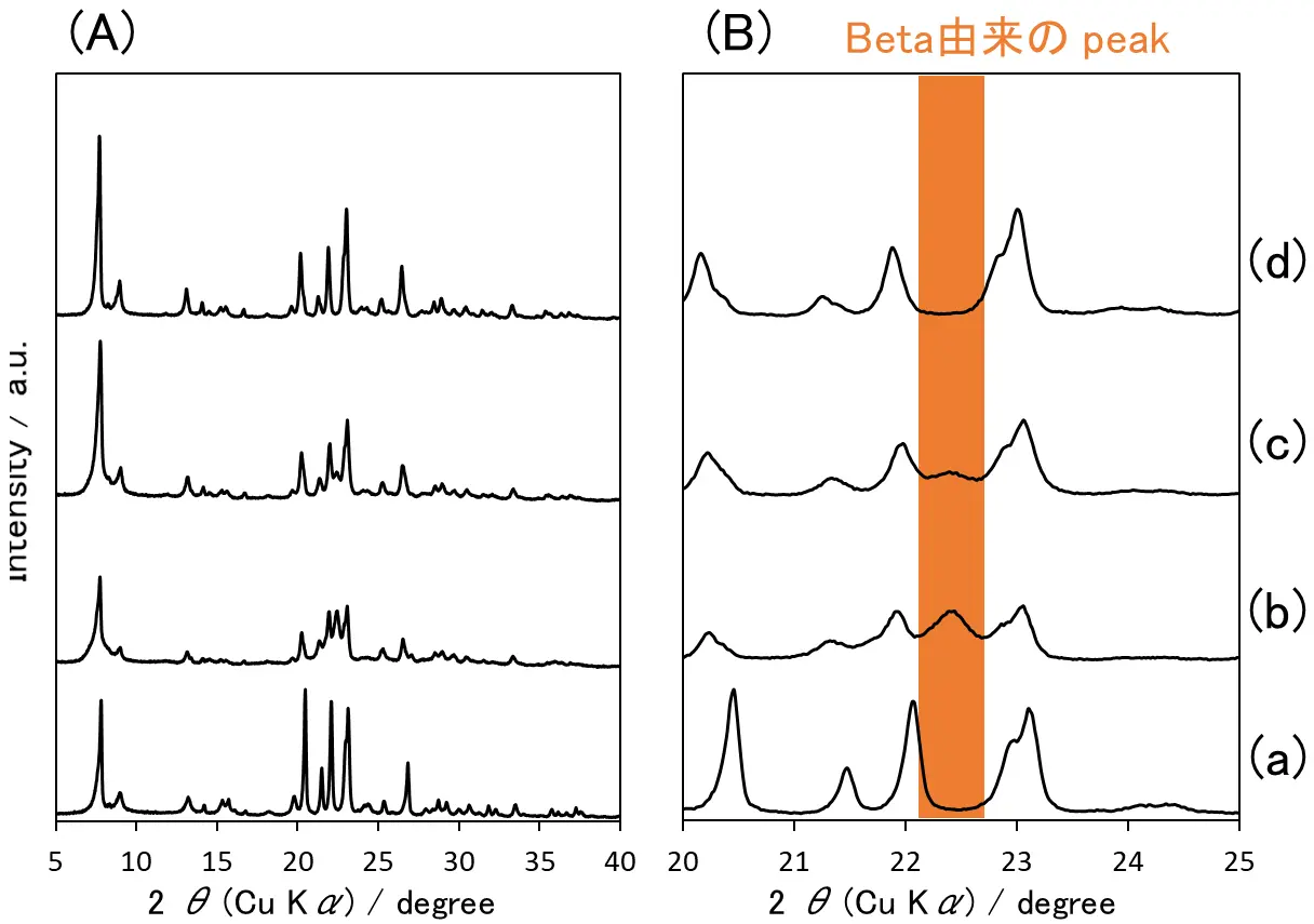 (d)原料にBetaおよびMFI型ゼオライトを用い、200℃条件で合成した仕込みSi/Al比20の試料