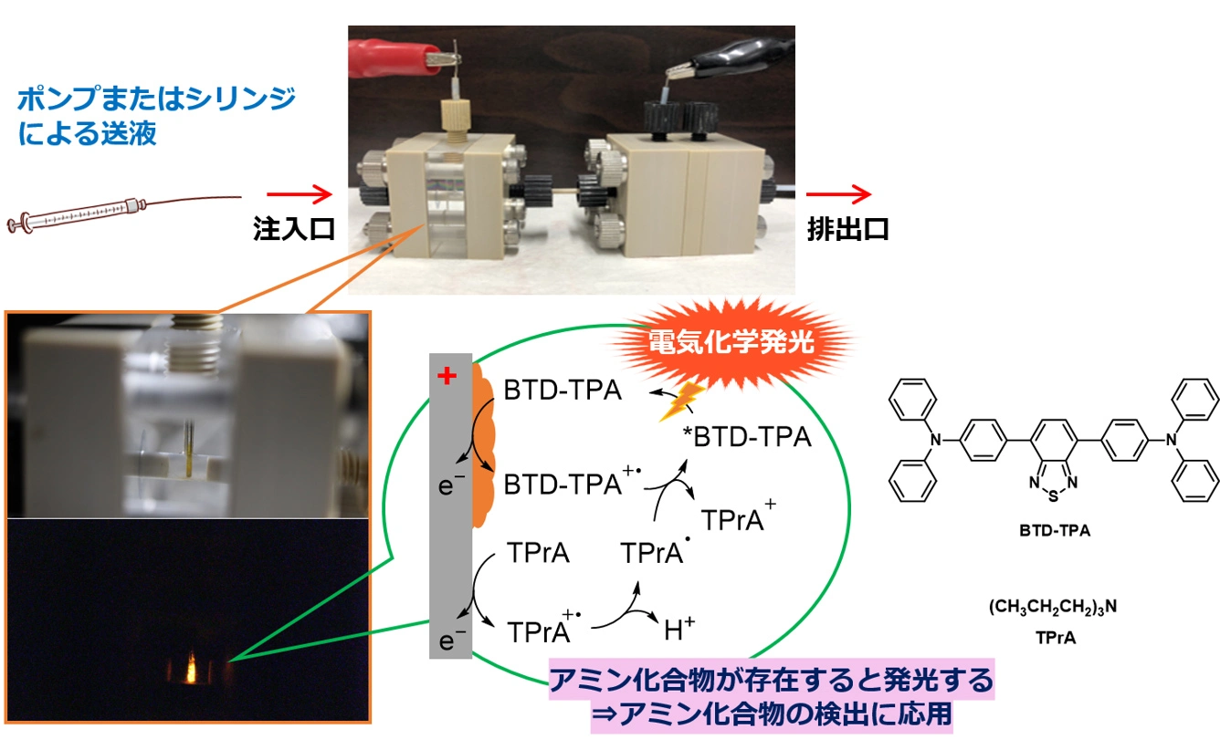 本研究では、樹脂モノリス製多孔質材料を充填した流路を備えた電気化学セルを用いて、流動電位を発生させてバイポーラ電極を駆動しました(図1)。駆動においては低濃度の電解質を含むアセトニトリルと水との混合溶液をポンプで送液し、約10 Vの流動電位を観測しました。次に、酸化反応が起こる上流側の電極に電気化学発光のための発光体を固定化し、光を透過する石英製のセルを用いて溶液を送液しました。無給電電気化学反応装置による共反応物型電気化学発光[用語6]の検討においては、分析対象としてアミン化合物を用いました。図2に示すように、アミン化合物が存在する際に発光するベンゾチアジアゾール‐トリフェニルアミン化合物(BTD-TPA)を電極に固定し、アミン化合物の検出を試みました。具体的には、トリプロピルアミン(TPrA)などの脂肪族アミン化合物とBTD-TPAがそれぞれ電極上で酸化された後、生じる活性種同士が電子移動反応することによりBTD-TPAが発光します。この原理に基づき、1 mmol/Lの脂肪族アミン化合物を含む溶液を送液したところ、光電子増倍管[用語7]によりBTD-TPAの発光を検出することに成功しました(図2)。また、送液の体積流量を増大させると、流動電位が大きくなり、発光強度が増大するため、デジタルカメラを用いて発光を観測することができました。さらに、ポンプ送液の代わりにシリンジを用いて手押し送液した場合でも電気化学発光を観測することができ、まさに電力を用いない電気化学発光分析法を実現しました。