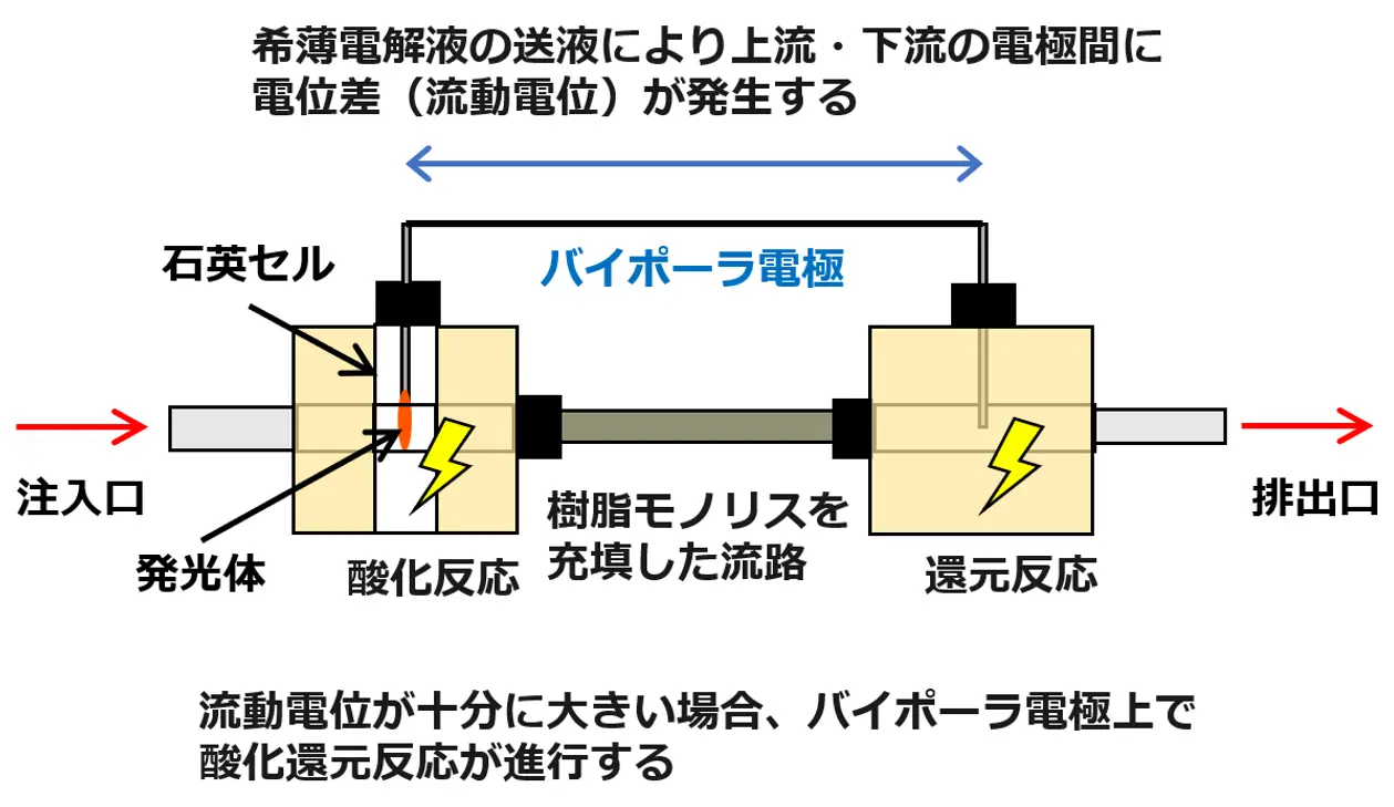 一方で、稲木教授らは電源装置を用いない無給電電気化学反応に関する研究を推進してきた背景から[参考文献1]、本研究では無給電電気化学反応の発光分析法への応用を着想しました。無給電電気化学反応の原理は、マイクロ流路に希薄電解液を送液する際に生じる電位差である流動電位を用いてワイヤレス電極(バイポーラ電極[用語5])を駆動することに基づきます(図1)。電気化学発光の無給電化は、分析装置の構成から変える画期的な取り組みであり、従来の常識にとらわれない新たな概念と言えます。