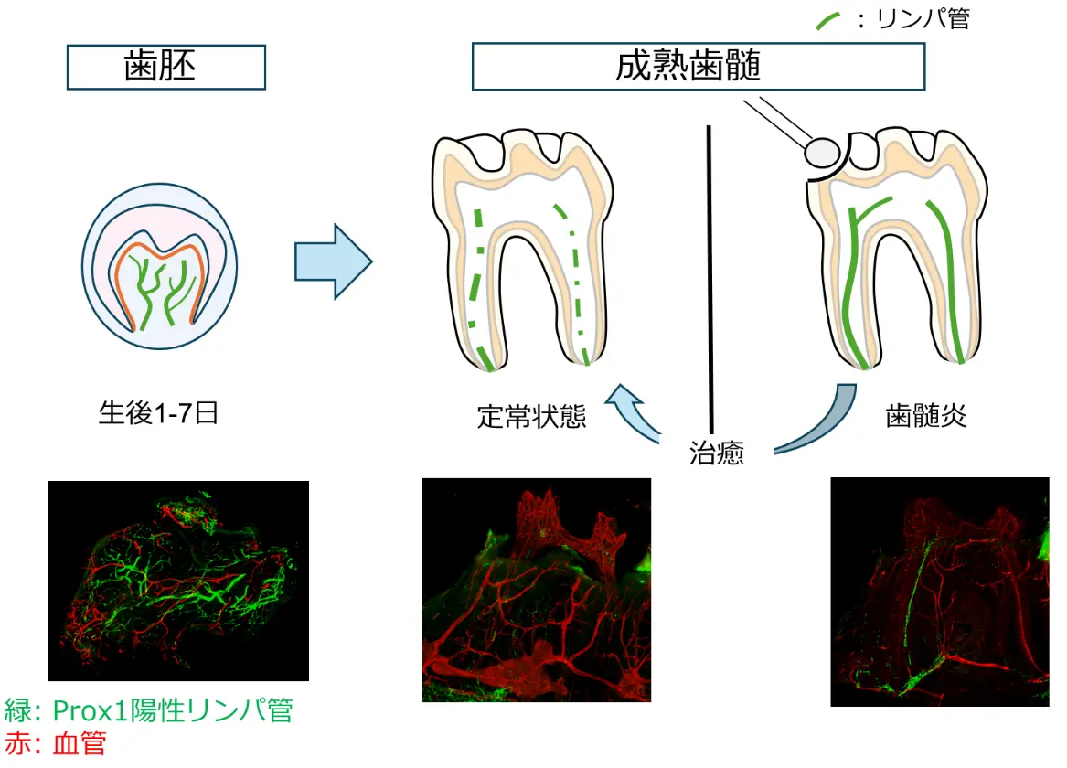 - 歯髄(しずい)のリンパ管は、歯の発達段階や炎症の有無によって数や形が変化する、動的な構造であることが判明しました。