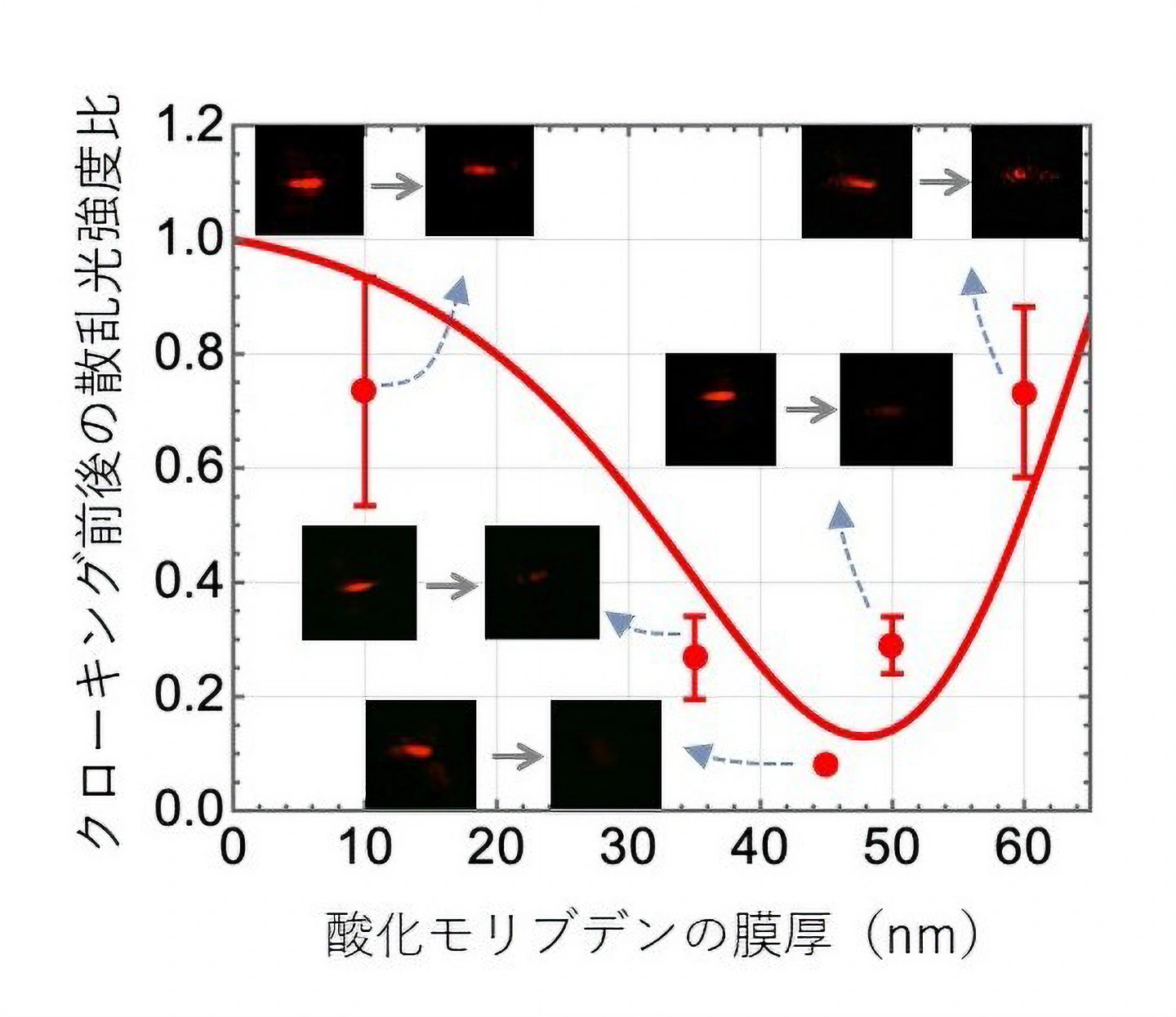 その結果、酸化モリブデンの膜厚が薄すぎる場合や厚すぎる場合には十分なクローキング効果が得られないものの膜厚が約45 nmの場合に効果が最大となり、散乱光強度が約8%まで抑制されることがわかりました(図3)。このことは、クローキングなしでは赤く視認されていた銀線が、膜厚約45 nmの条件ではほぼ不可視となることからも確認できます(図2右)。