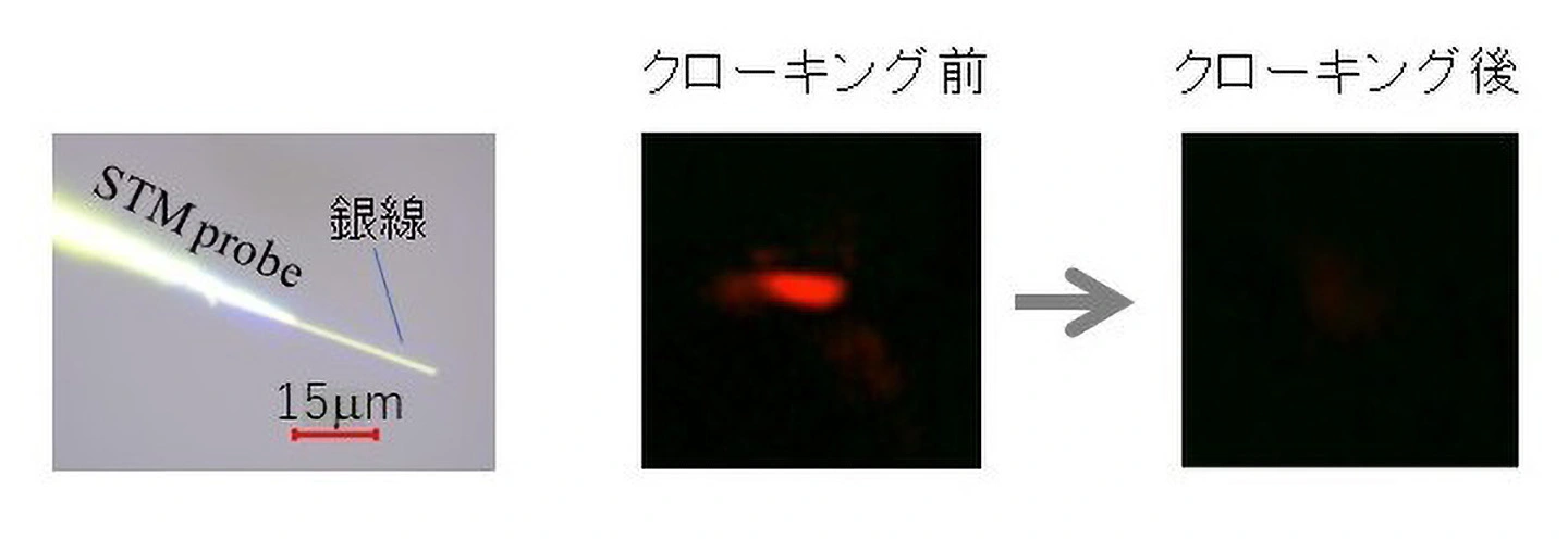 - STM:走査型トンネル顕微鏡(Scanning Tunneling Microscope:STM)。先が原子レベルで尖った金属製針をトンネル電流が一定となるように試料上で走査することにより試料を観察する顕微鏡。本研究では、針が尖っていることを利用して銀線の固定に用いた。