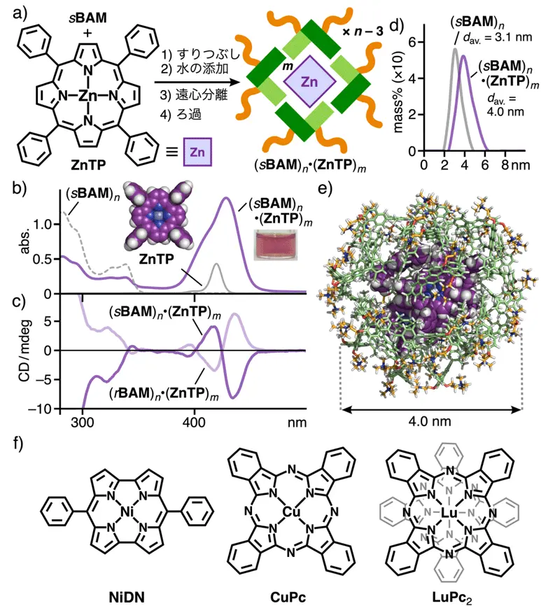 得られたキラルカプセル(sBAM)nをナノ道具として活用することで、種々の金属含有色素を効率的に内包して、優れたキラル光学特性を発現させました。例えば、両親媒性分子sBAMと亜鉛含有ポルフィリン色素ZnTPの固体をすりつぶしで混合して、水を加えた後に、余剰のZnTPを除くことで内包体 (sBAM)n•(ZnTP)m の紫色水溶液が定量的に得られました(図3a)。この溶液のUV-visibleスペクトルでは、ZnTPに由来する強い吸収帯が380〜470 nmに観測されました(図3b)。またDLS、NMRやMMによる構造解析から、主生成物は5分子のZnTPを25分子のsBAMで内包した約4 nmの球状集合体であることが示されました(図3d、e)。本来は非キラルであるZnTPがキラルカプセルに内包されることで、CDスペクトルで強いコットン効果が観測されるようになり、光学活性化(非対称因子[用語9]gabs= 3 × 10–4)が達成できました(図3c)。本手法はさまざまな金属含有色素に適用できることも確かめられました。白金、銅、パラジウムを含有するポルフィリン色素や反芳香族性のニッケル含有ノルコロール色素NiDN(図3f)でも、キラルカプセルの効率的な内包によって、強い光学活性の付与(gabs = 5〜8 × 10–4)にも成功しました。
