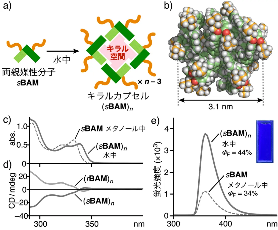 まず、両親媒性分子sBAMを市販の化合物から5ステップで合成しました。この分子を水に溶かすだけで、キラルカプセル(sBAM)nが定量的に形成されました(図2a)。このキラルカプセルを核磁気共鳴分光法(NMR)、動的光散乱法(DLS)や分子モデリング(MM)を用いて分析したところ、12個のsBAMからなる、平均直径が約3 nmの球形集合体の形成が示されました(図2b)。また、カプセルの紫外可視(UV-visible)スペクトルでは、310〜355 nmにビナフチル骨格に由来した吸収帯を示し、さらに、円二色性(CD)[用語7]スペクトルでは、同じ波長領域に正のコットン効果[用語8]が観測されたことから、芳香環キラル空間の形成が確認できました(図2c、d)。メタノール中および水中での蛍光スペクトルから、カプセル形成による蛍光効率の向上(1.3倍)が見られました(図2e)。また、鏡写しの立体関係にあるキラルカプセル(rBAM)nも同様に作製しました(図2d)。