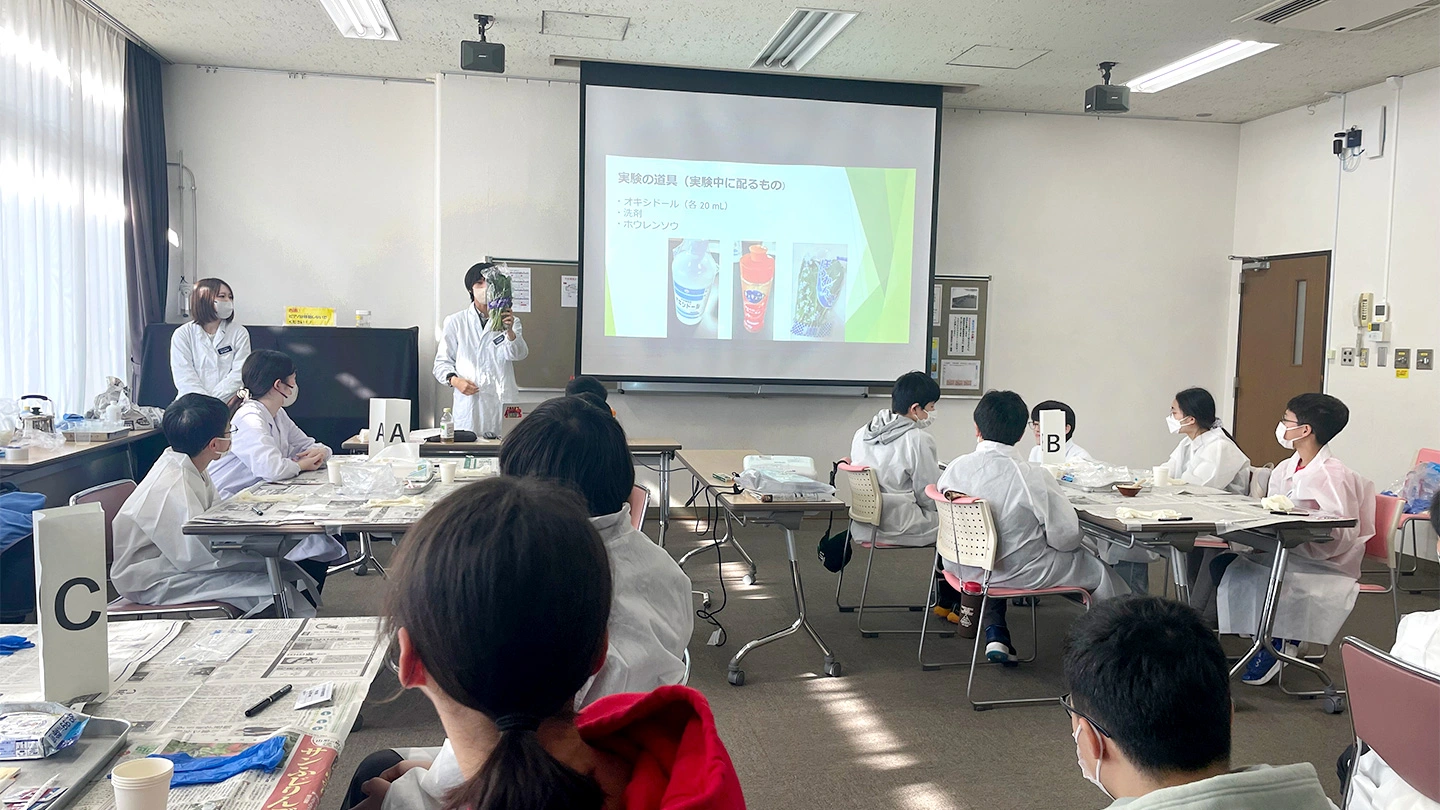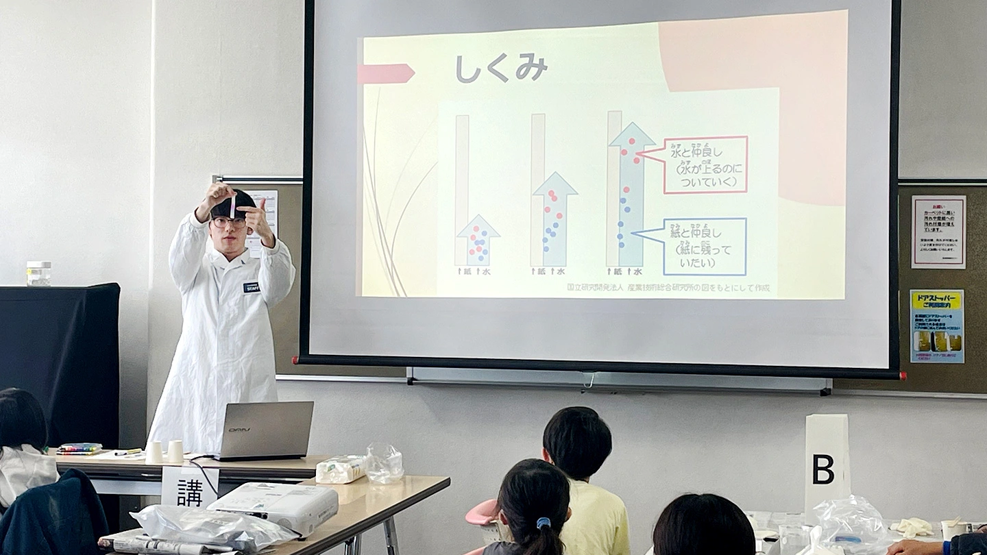 午前と午後の2部構成で、午前の小学生の部(3~6年生)は「カラフル変身!? インクや葉っぱの秘密を探ろう!」、午後の小・中学生の部(小学5年生~中学生)は「泡が出るにはワケがある! 生き物の力 大発見!」という内容で実施しました。午前、午後ともに生命理工学院 生命理工学系の学生が講師を務めました。