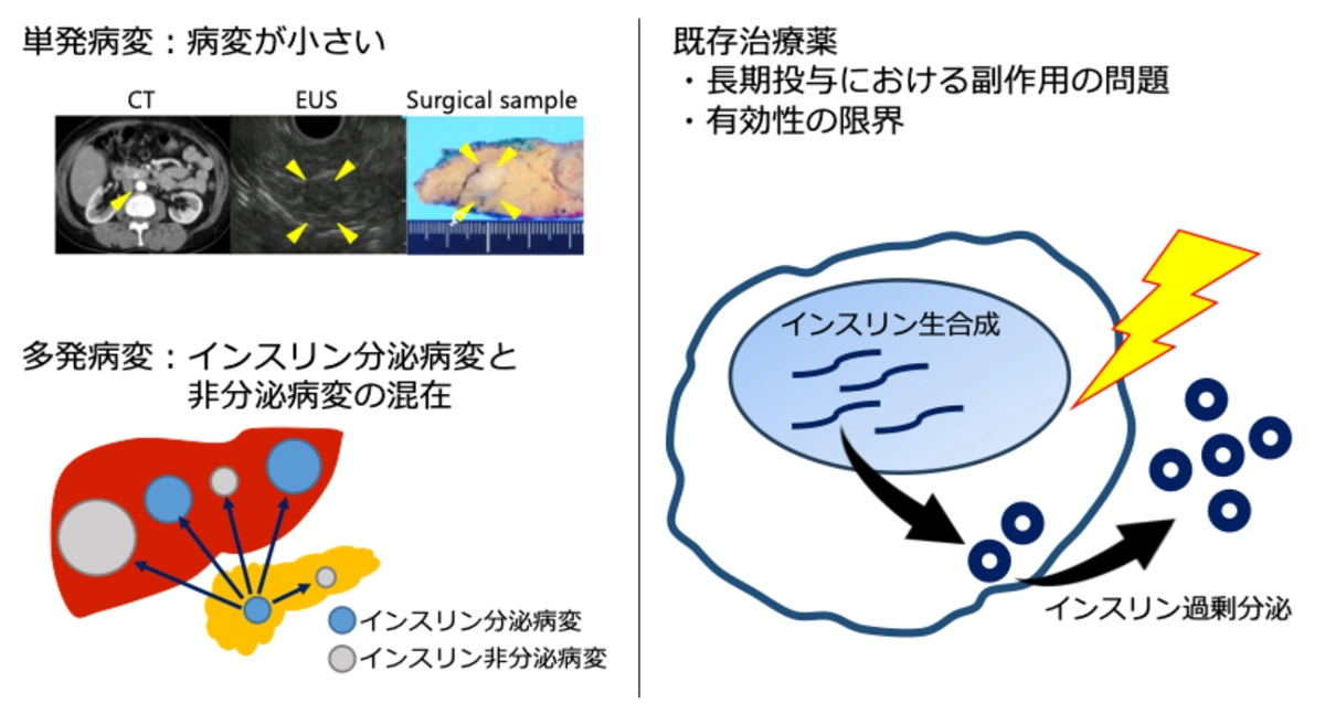 このように、インスリン分泌病変を正確に同定する新たな診断技術の開発と、インスリン過剰分泌を安全に抑制する新規薬物治療の創出が強く求められています(図1)。しかしインスリノーマは希少疾患であり、症例の蓄積不足や検体採取の困難さから、研究が進みにくい状況が続いていました。