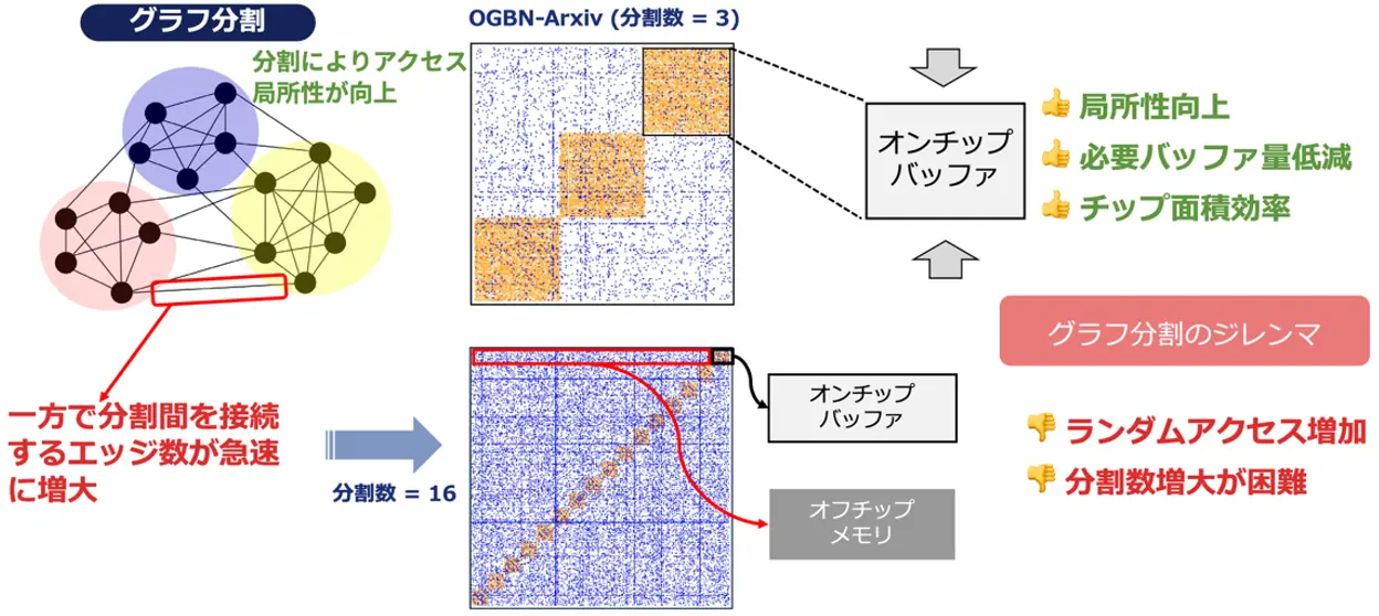 グラフのデータサイズが膨大となる問題を解決するための一つのアプローチとして、「グラフパーティショニング」(グラフ分割とも呼ばれる)という手法が挙げられます。これは、巨大なグラフを結合が比較的密な小さな塊に分割して処理することで、メモリアクセスを局所化し、チップ上のバッファサイズを削減しようとするものです。しかし、この分割を細かくしすぎると(細粒度パーティショニング)、分割された塊同士を繋ぐエッジ(接続情報)の数が増え、結果的にチップ外のメインメモリへのアクセス回数が増加してしまい、全体の性能をかえって悪化させてしまうというジレンマがありました。