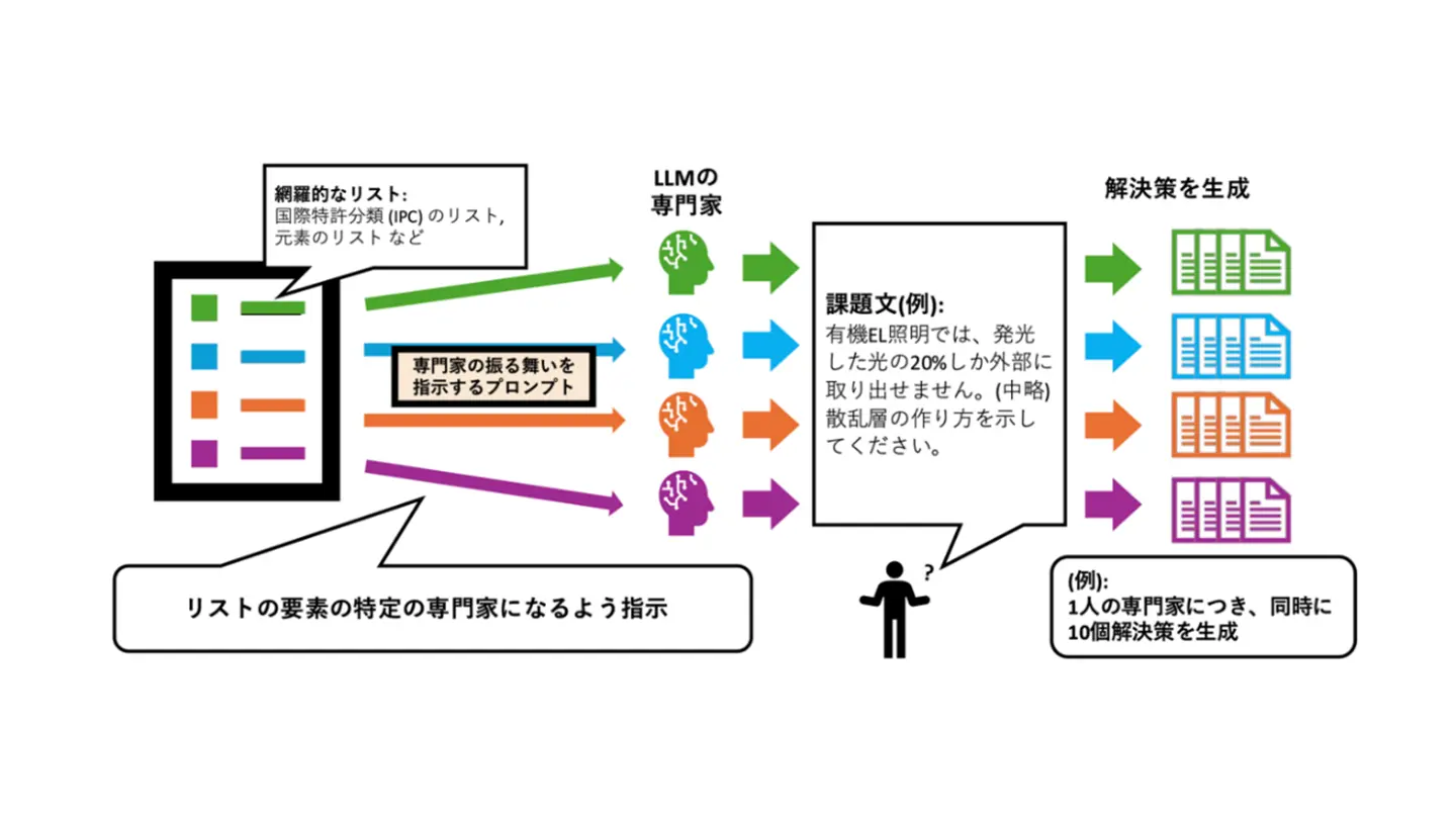 本研究では、「専門家」を作成するリストとして、有機EL光取り出し基板開発の例では国際特許分類のリストを、IGZO-TFTの接触抵抗の例ではさらに元素のリストを使用し、「専門家」を作成しました。これらの「専門家」に各課題に対する解決策を10個ずつ生成させ、多様な解決策を得ました。なお、解決策の生成には比較のためGPT-4o、Llama 3.3 70B、DeepSeek V3を用いました。