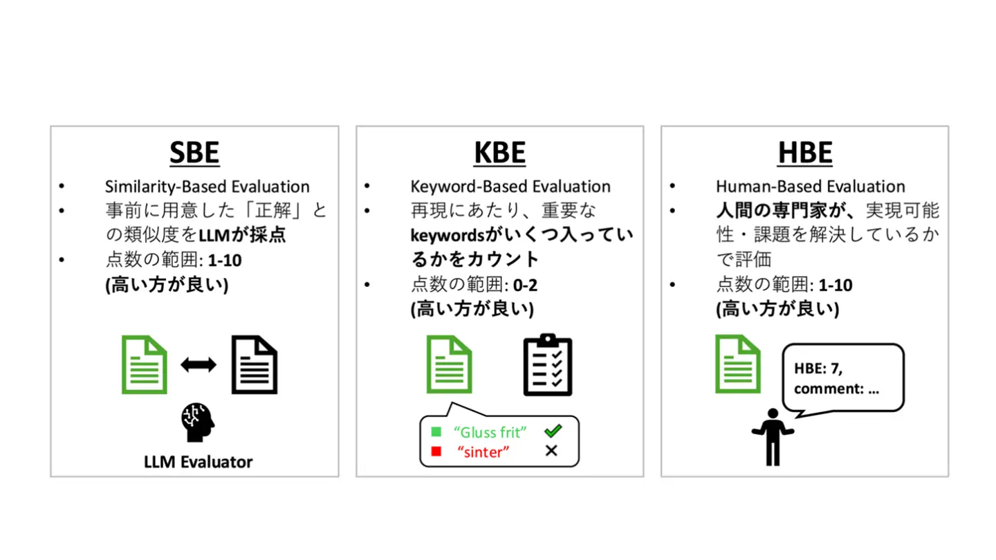 生成された解決策の評価を行うために、3種類の方法で採点を行いました(図2)。1つ目は、先行研究で提案された解決策をあらかじめ「正解」として設定し、これに対する類似度をLLMに評価させることで評価(Similarity-Based Evaluation, SBE)を行いました。2つ目は、解決策のテキストの中に重要なキーワードがいくつ入っているのかをカウントすることで評価(Keyword-Based Evaluation, KBE)を行いました。3つ目として、人間の専門家が直接解決策の中身を確認して、解決策の実現可能性や課題を解決できているかどうかで評価(Human-Based Evaluation, HBE)を行いました。