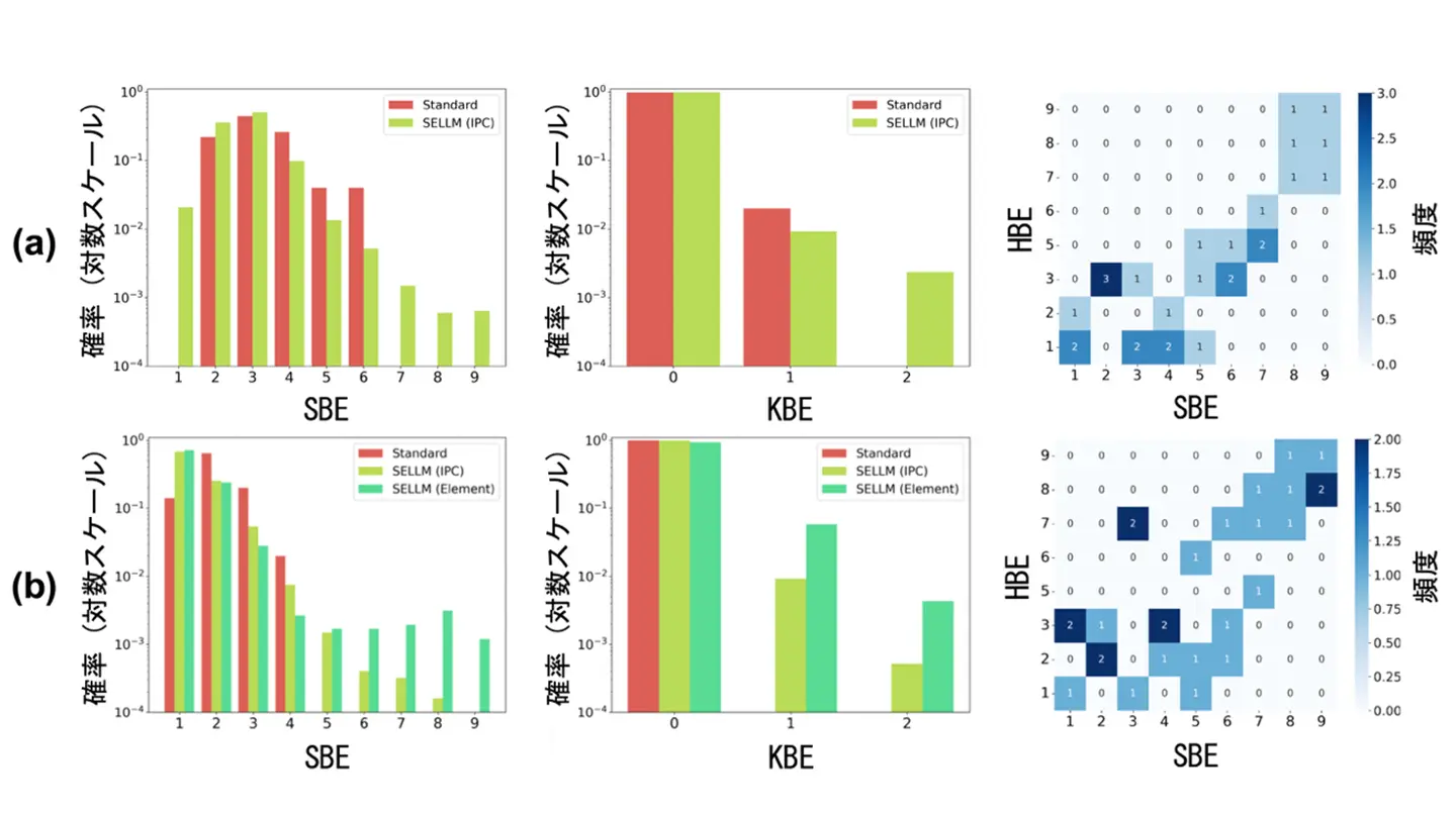 a:光取り出し課題について、Standardと国際特許分類(IPC)をリストとして用いたSELLMのそれぞれの方法で生成した解決策の評価結果。左のグラフはSBEの点数分布を、中央のグラフはKBEの点数分布を示す。右のグラフはSELLMで生成された一部の解決策で、HBEとSBEの関係を示す。