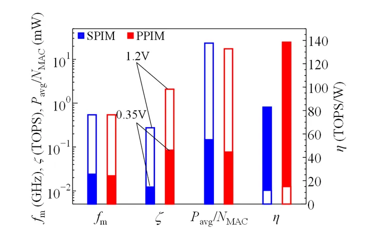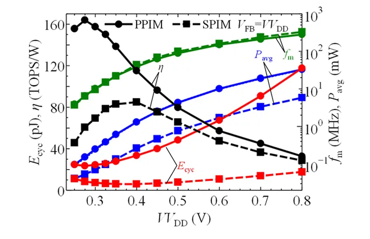 図3に、SPIMとPPIMにおけるPavgを並列数(NMAC)で規格化した電力Pavg/NMAC、演算能力ζを示します。また、同図には動作周波数fm、エネルギー効率ηも示してあります。ここでは電源電圧(仮想電源電圧VVDD)が1.2 Vと0.35 Vの場合を比較しています。SPIMと比較してPPIMは1.2V動作、0.35 V動作どちらにおいてもfmはわずかに低下しますが、8並列MAC演算の導入によってζは大きく向上しています。また、MAC演算あたりの電力Pavg/NMACは、PPIMではSPIMの場合と比較して、1.2 V動作で25%程度、0.35 V動作では~50%程度も低減できます。これらから、PPIMではEMP近傍である0.35 V動作でηを大幅に向上できることが分かります(1.2 Vのηから10倍)。以上のように、MAC演算を並列化したPIM (PPIM)では、EMPの低減によるエネルギー効率の増大が可能であることが分かりました。