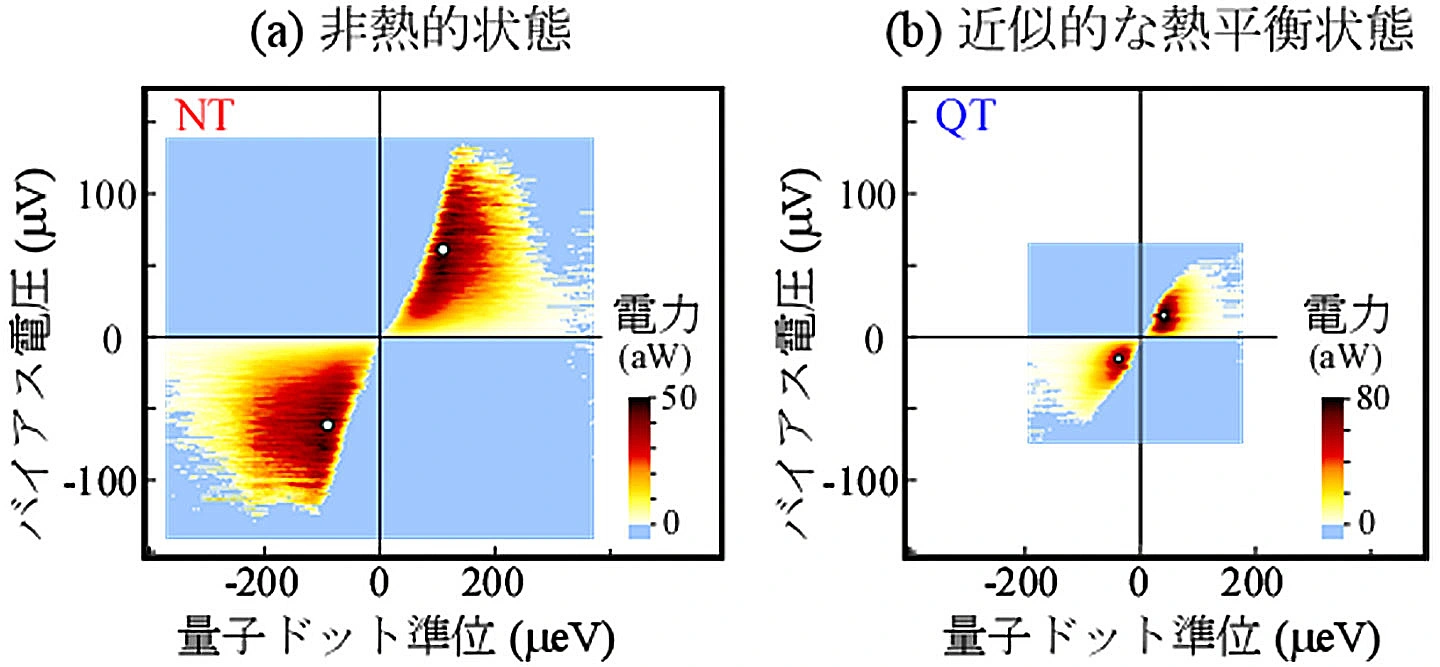 - 量子ドット:狭い領域に電子を閉じ込めた構造で、量子閉じ込め効果によりエネルギーが離散化される。量子ドットを用いた熱電機関は、熱平衡状態の熱源に対して、カルノー効率やカーゾン・アールボーン効率といった熱力学的な効率の上限に近い熱効率を示すことが知られている。本研究では、非熱的状態に対して、これらの上限を超える熱効率を示すことに成功したものである。