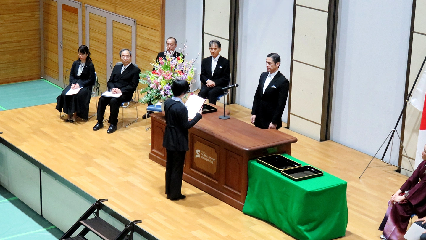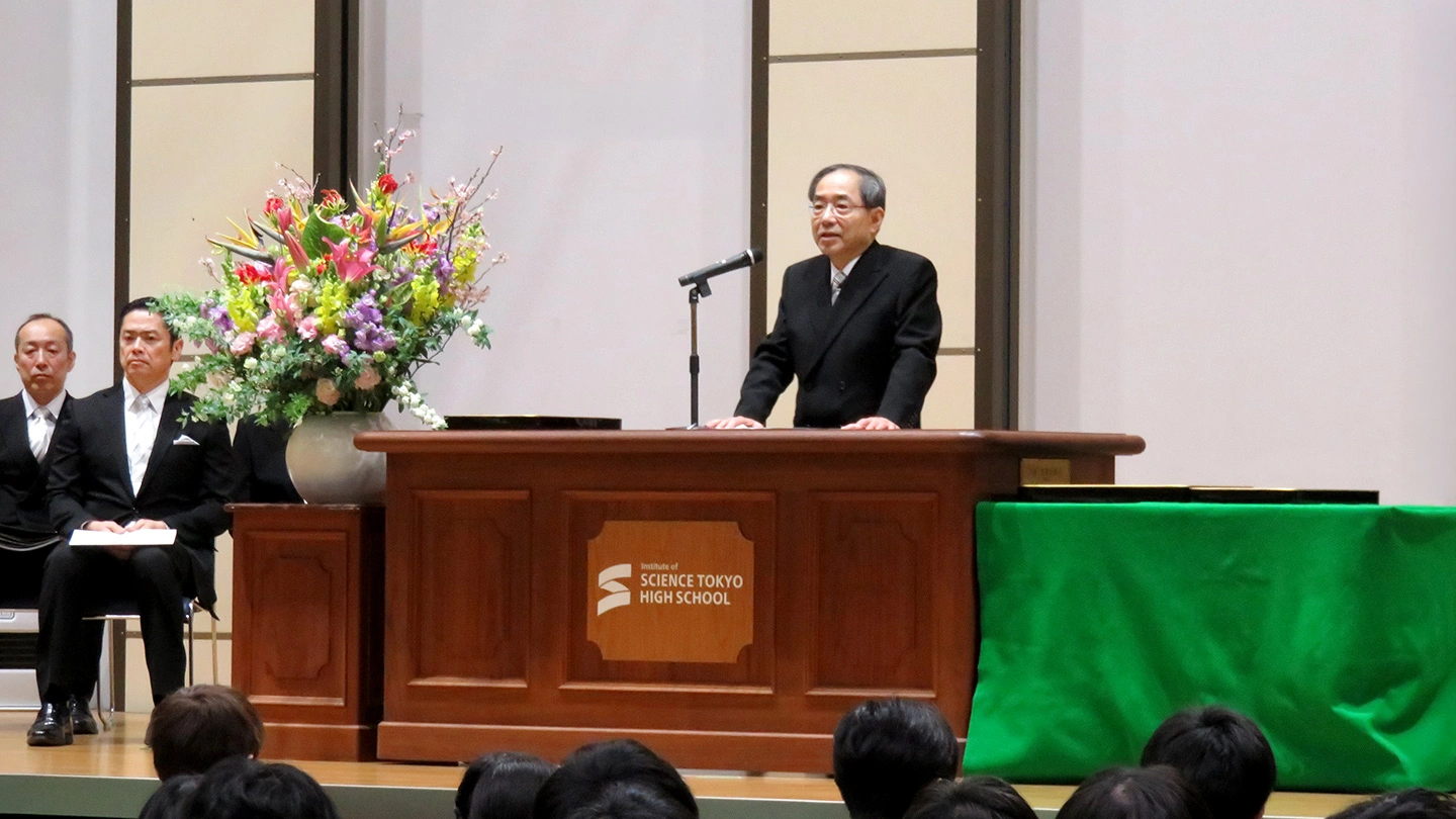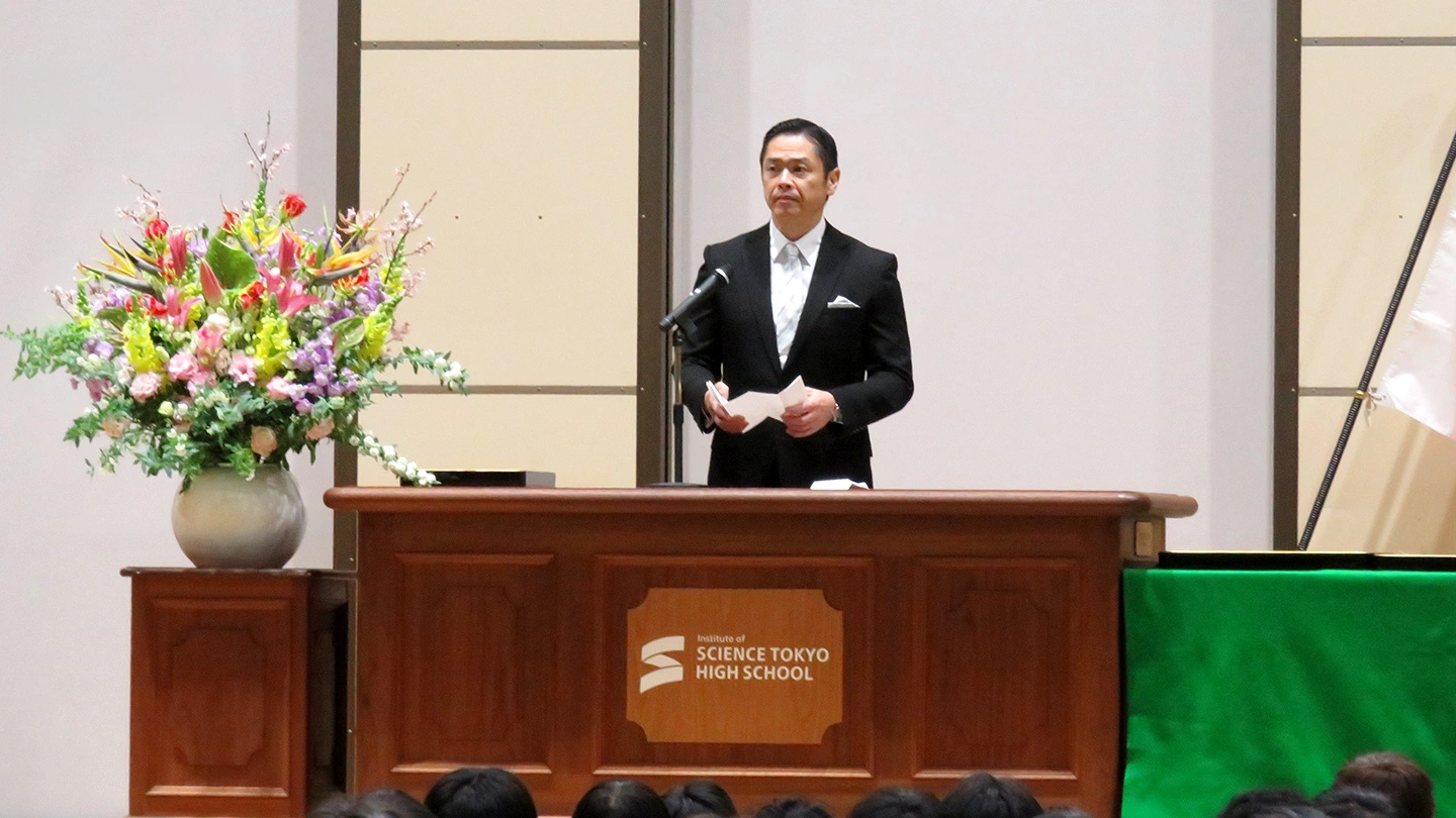 次に、Science Tokyoの田中雄二郎学長は祝辞として、「附属高校での学びは受験のためだけではありません。困難に直面したとき、立ち止まり、考え、他者と対話しながら答えを探す力こそが、これからの人生を支える土台となります。知識の量よりも、『自ら考え、判断し、行動する』力をこれからも大切にしてください」と述べました。さらに、「皆さんには、失敗を恐れず挑戦を続けてほしいと思っています。ここで得た友人たちや先生とのつながりは、附属高校が移転した後も、母校への誇りとともに、一生の宝となるはずです」と卒業生にエールを送りました。