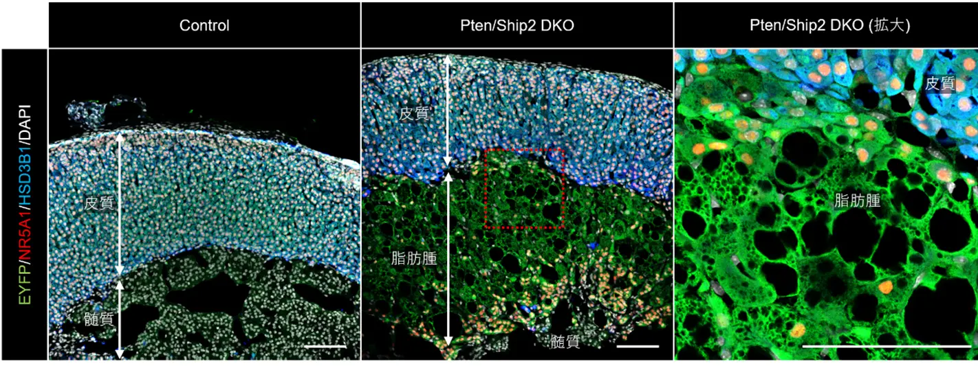 (下)副腎は皮質と髄質から構成される組織であるが、 Pten/Ship2を欠損した副腎では大量の脂肪細胞(脂肪腫)が皮質と髄質の境界部に出現した。