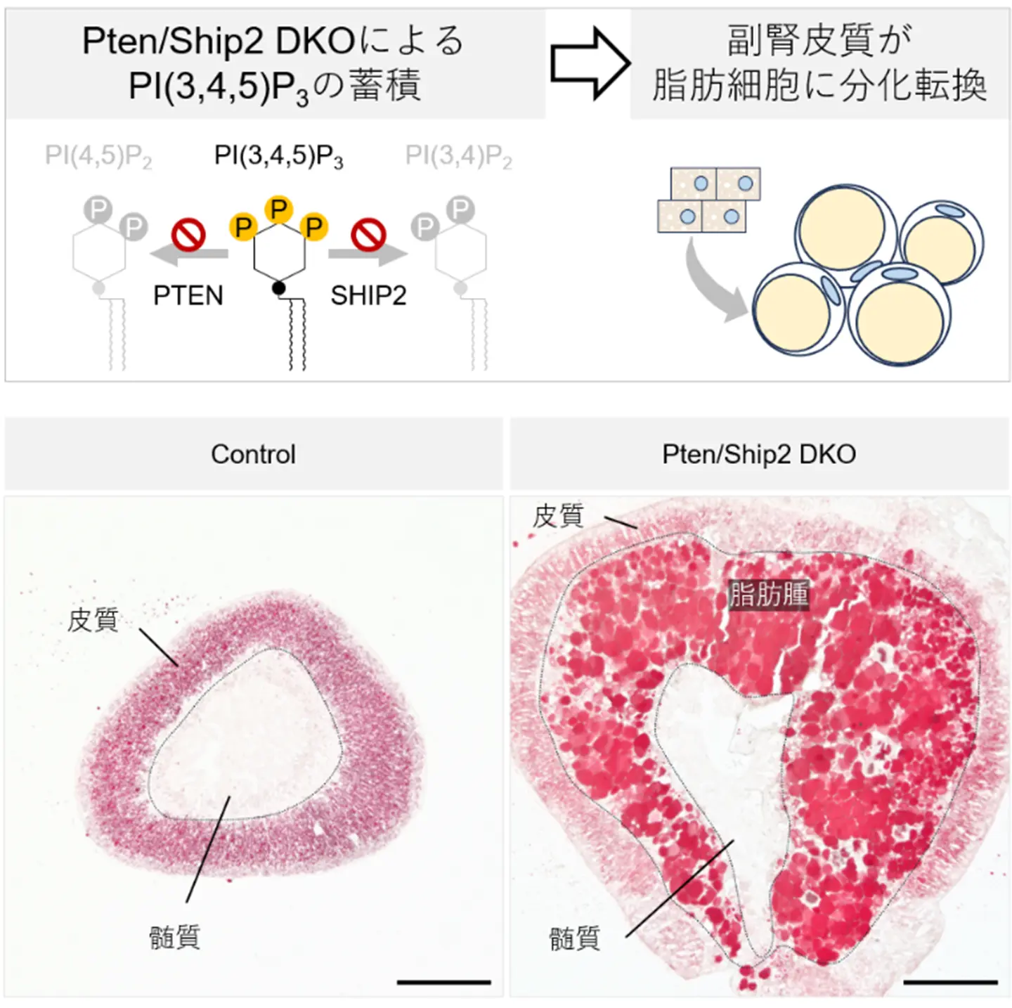 本研究では、副腎皮質で PI(3,4,5)P3 を分解する酵素 PTEN/SHIP2 を同時に欠損させたマウスを作製し、PI(3,4,5)P3 の蓄積がAKT経路[用語2]の持続活性化と転写因子 PPARγ[用語3]の異所性発現を介して、副腎皮質 X-zoneの細胞を脂肪細胞様に転換させることを実証しました。これにより、副腎に本来存在しない脂肪組織が出現する分子機構を動物モデルで再現し、内因性リン脂質シグナルが細胞運命を非遺伝的に制御することを示しました。