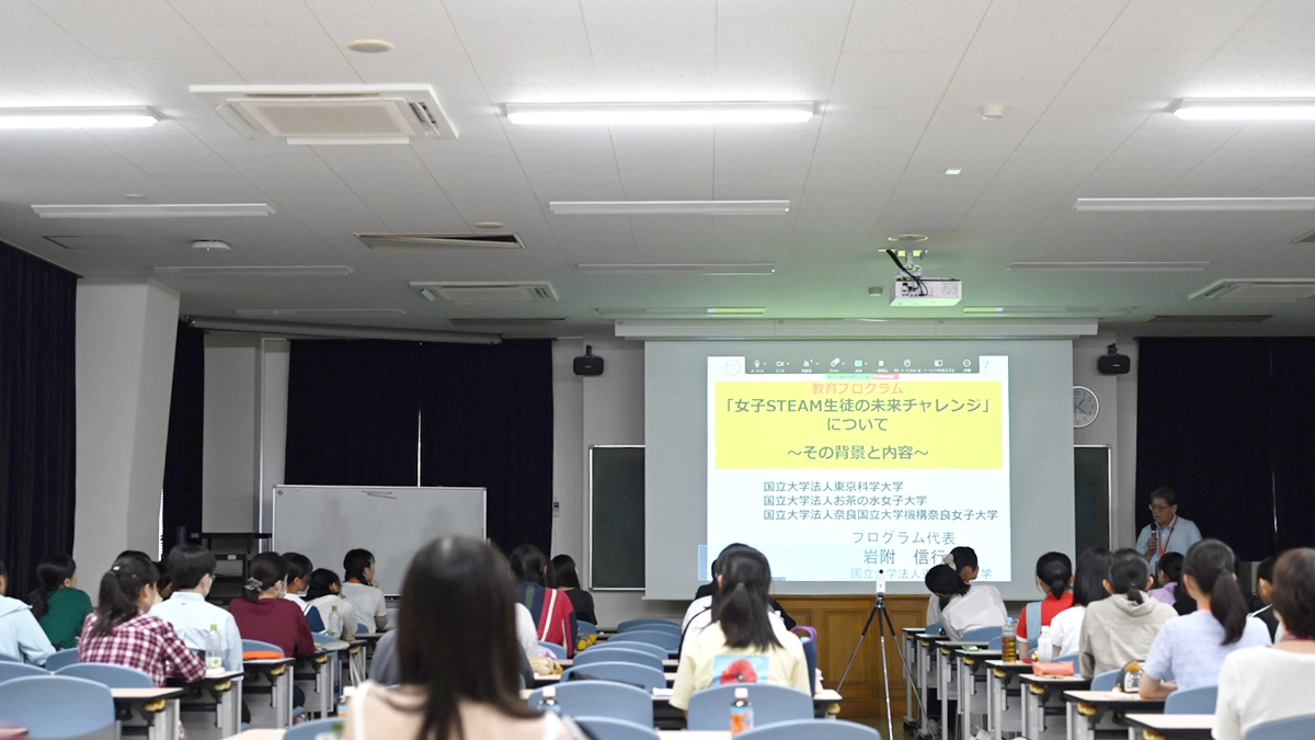 初日の午後から開校式が開かれ、お茶の水女子大学の佐々木泰子学長、奈良女子大学の高田将志学長による、女子STEAM生徒への期待と激励のこもったあいさつがありました。その後、本キャンプの意義、目的と内容についての説明が行われました。