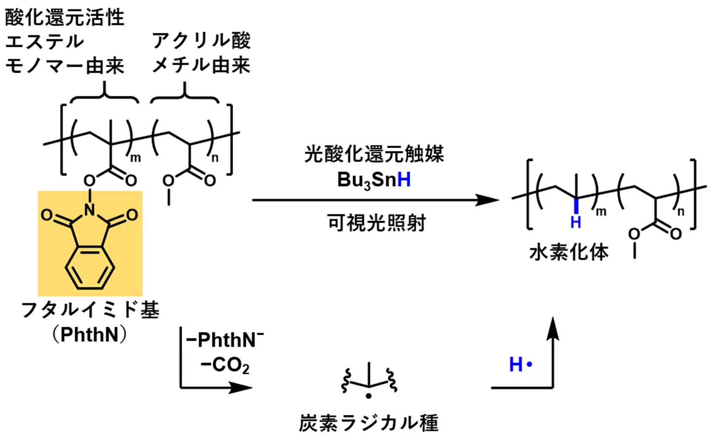 近年、可視光照射という穏和な条件で駆動する光酸化還元触媒反応を用いて、高分子を変換する方法が開発されています。図1に示すように、酸化還元活性エステルを含むモノマーとアクリル酸メチルの共重合体[用語8]を前駆体高分子とし、光酸化還元触媒存在下で可視光照射することにより、フタルイミド基と二酸化炭素が脱離して主鎖上に反応性の高い炭素ラジカル種が生成します。最近の研究では、水素ラジカル源となる水素化トリブチルすず(Bu3SnH)や安定なラジカル種として知られる2,2,6,6-テトラメチルピペリジン 1-オキシル(TEMPO)を共存させることにより、高分子に水素やTEMPOを導入し新しい高分子骨格を構築できることが報告されています。しかしながら、これまでに報告されている光酸化還元触媒を用いた高分子の変換反応は、上記の炭素ラジカル種を用いた反応に限られており、導入できる官能基に制約がありました。もし前駆体高分子にさまざまな官能基を導入することができれば、多彩な機能性を付与することができると期待されます。