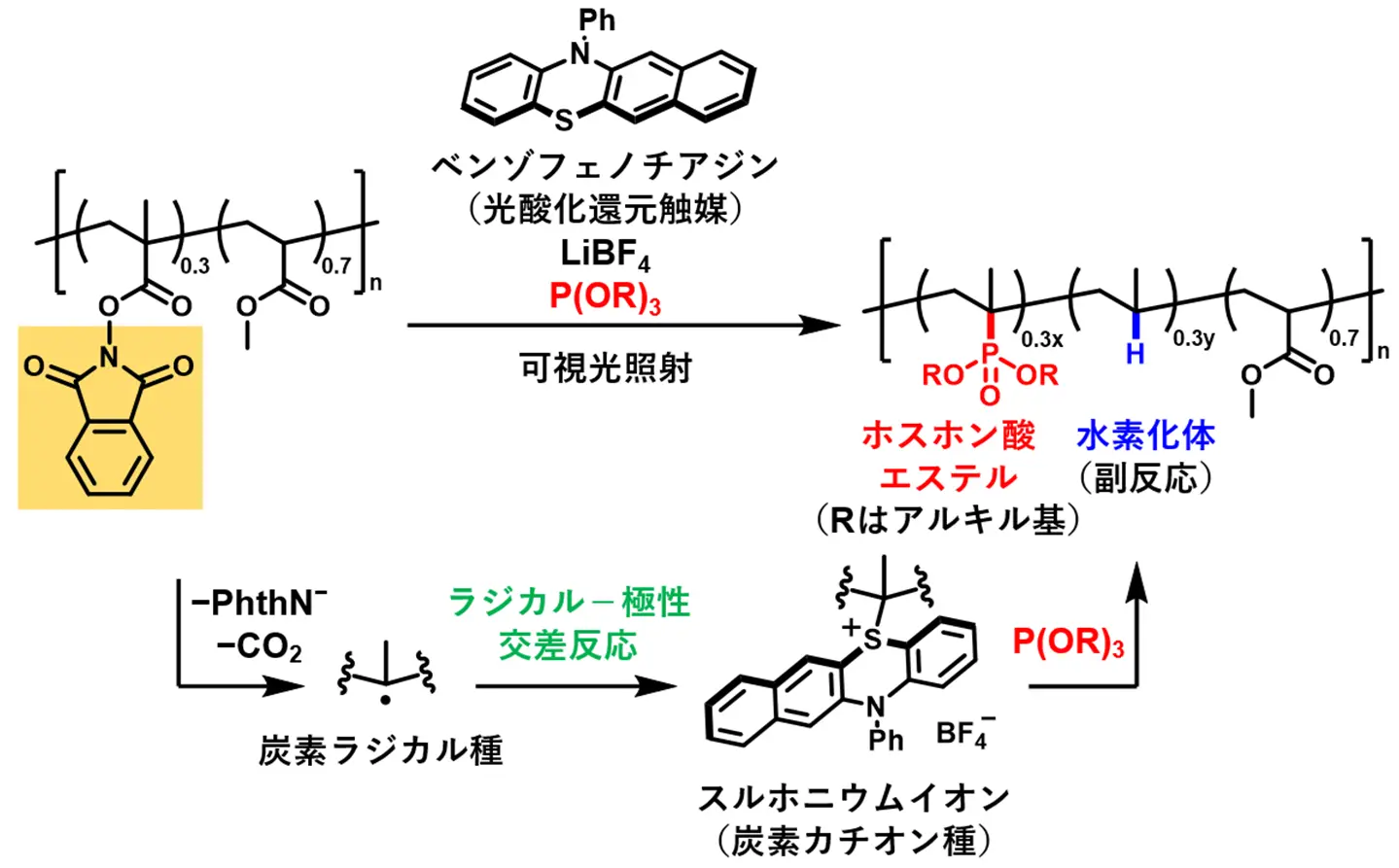 本研究では、高分子化合物におけるラジカルー極性交差反応での求核剤との反応を検討しました。ベンゾフェノチアジン型光酸化還元触媒の存在下、フタルイミド基を有するメタクリル酸エステルとアクリル酸メチルの共重合体を用いて、亜リン酸トリアルキル(P(OR)3)を求核剤として可視光照射を行ったところ、高分子主鎖上にホスホン酸エステルを導入することに成功しました。これは、図2に示すように、スルホニウムイオン(炭素カチオン種)を生成し、求核剤である亜リン酸トリアルキルと反応したことを意味しており、高分子化合物に対して光酸化還元触媒を用いるラジカルー極性交差反応に成功しました。一方で、目的としたホスホン酸エステルの導入に加え、水素化体の副生も観測されました。この水素化体は炭素ラジカル種が水素ラジカルと反応する副反応に由来します。今後はこの副反応の抑制が課題となりますが、今回得られた高分子は、ホスホン酸エステル、水素化体、アクリル酸メチル由来の骨格を持つ複雑な高分子構造となりました。これは対応するモノマーの重合では得ることができない特殊な構造であるため、本手法により得られた新規骨格の高分子自体の機能や付加価値も期待されます。