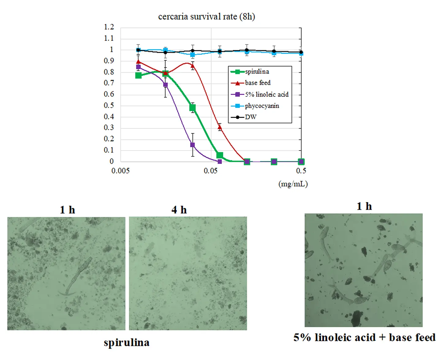 次に、スピルリナ飼料の粉末を用いて、巻貝から游出したセルカリアに対する直接的な影響を調査しました。その結果、スピルリナ飼料粉末および基本飼料粉末のいずれも、セルカリアに対して殺滅効果を示しました(図2)。この殺滅効果は、セルカリアの誘引および尾部の切断によるものと考えられ、過去の研究で報告されているリノール酸(不飽和脂肪酸)の作用と類似していることが示唆されました。
