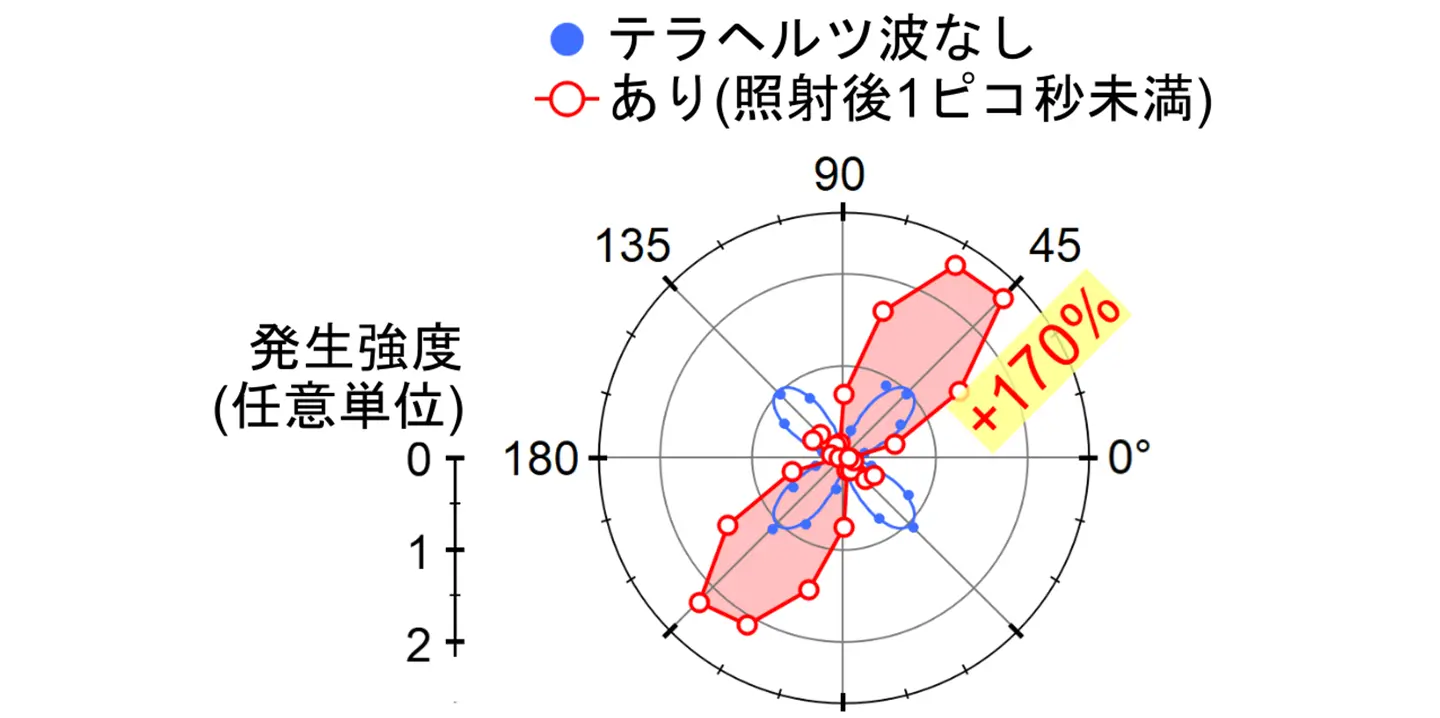 実験では、分極の大きさや方向の変化を調べるために、テラヘルツ波の照射下において、光第二高調波発生[用語9](SHG)を測定しました。図2は、入射光の偏光角に対するSHG発生強度の変化を示しています。テラヘルツ波を照射していないとき、グラフの形状は結晶対称性を反映して四つ葉型でしたが、テラヘルツ波照射後わずか1ピコ秒未満で全く異なる形に変化しました。このことは図1(b)に示したように、分極が傾いたことを意味しています。特定の角度(45°)で観測されるSHG発生強度の増加率は最大で170%と、バルク強誘電体として最大の値を示しました。これまでの最大は、同程度の条件で約80%でした。LuFe2O4が極めて敏感な特性を持つことが解ります。