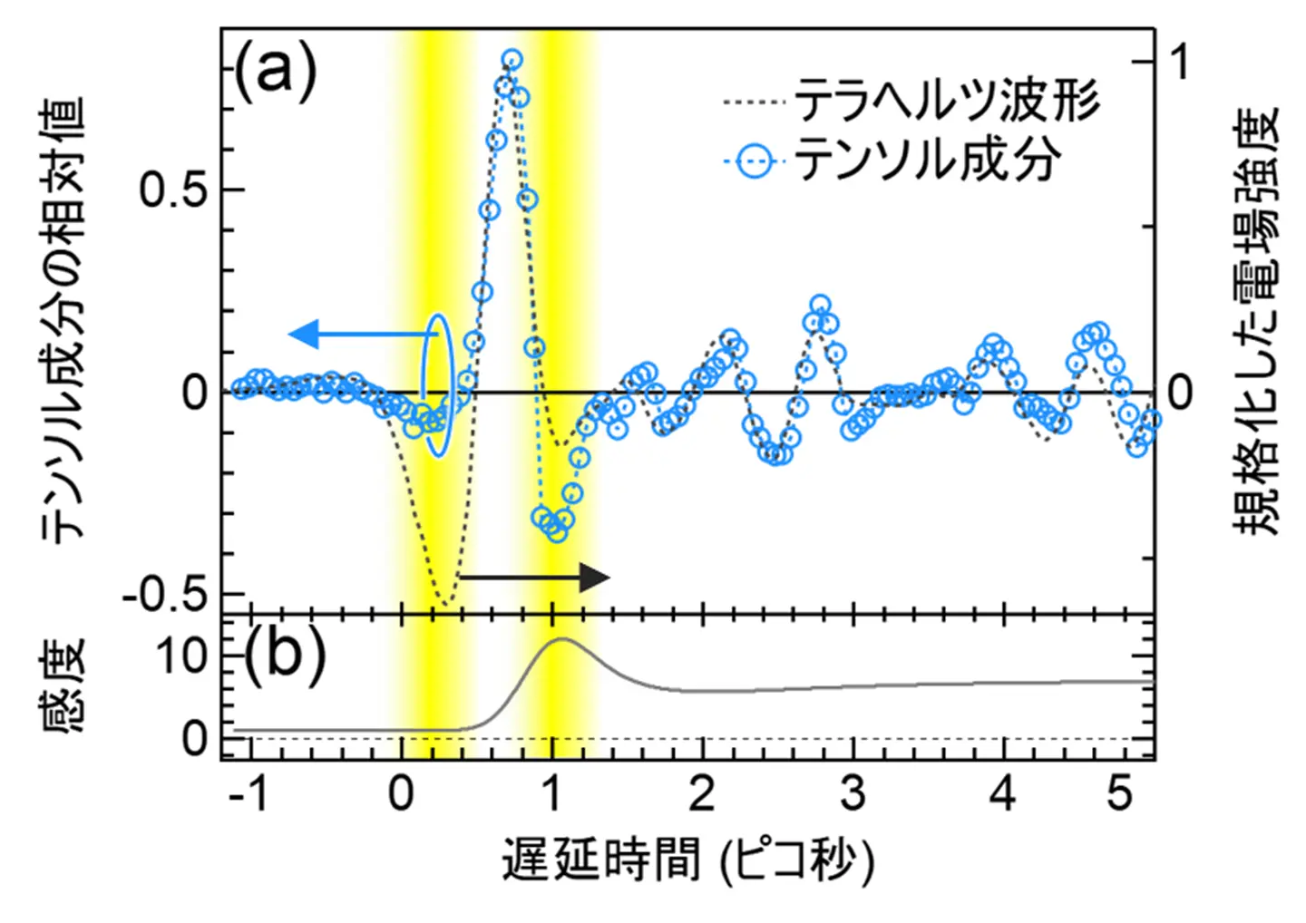 このような分極応答の敏感性の理由を調べるために、私たちは、図2の角度分布を非線形感受率テンソル解析[用語10]という手法によって調べ、分極の傾き(方向)がどのようなダイナミクスを示すのかを明らかにしました。