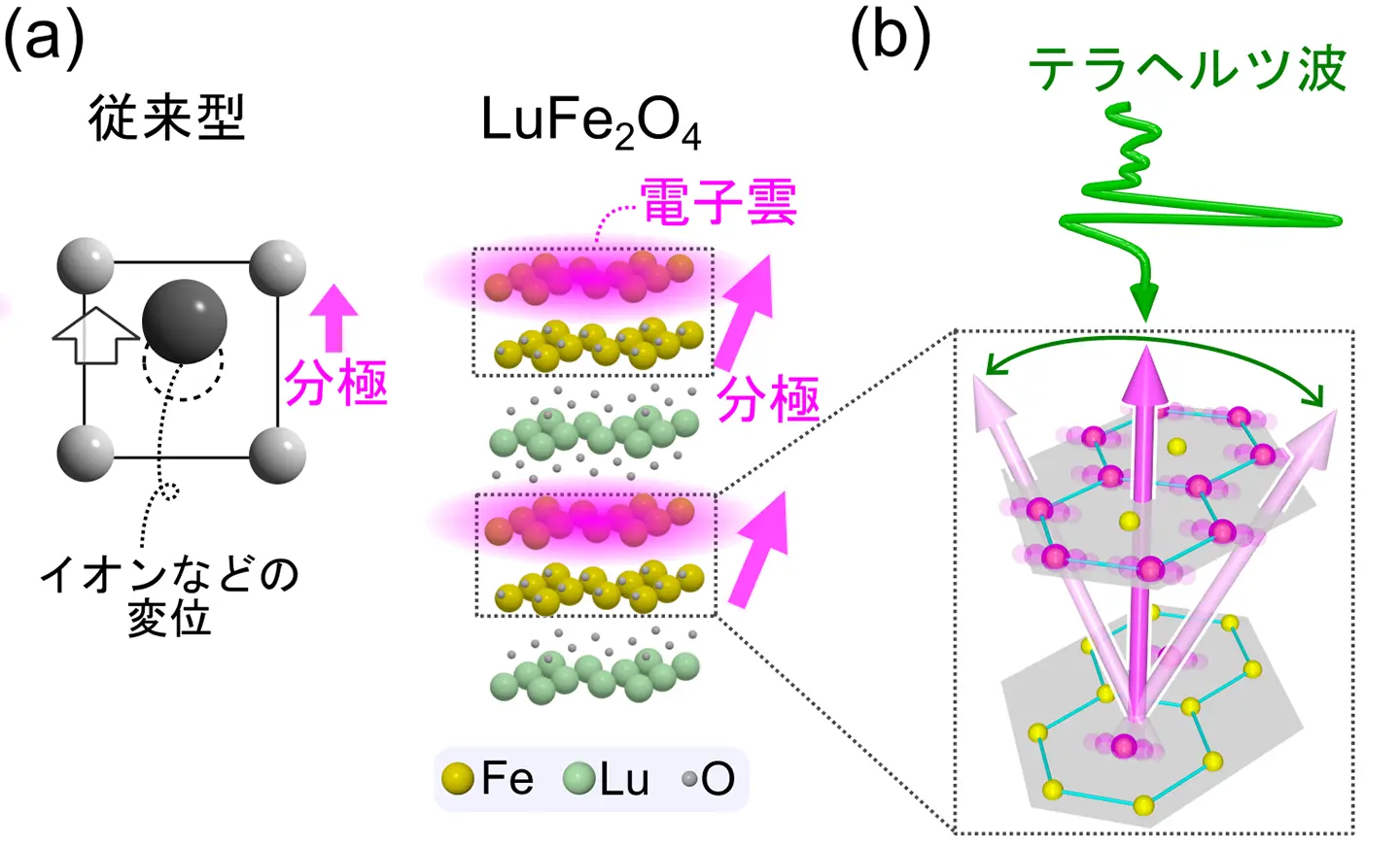 今回、研究グループは、無機物質である遷移金属酸化物の電子強誘電体である、ルテチウム鉄酸化物LuFe2O4(図1(a)右)に注目しました。この物質に、近年基礎研究から、応用分野まで広く活用されているテラヘルツ電磁波を照射したところ、強誘電分極が極めて敏感に変化し(図1(b))、バルク強誘電体として過去最大の変化量を示すことを発見しました。また、この特性が、多数の電子の協力効果によって生じていることを明らかにしました。