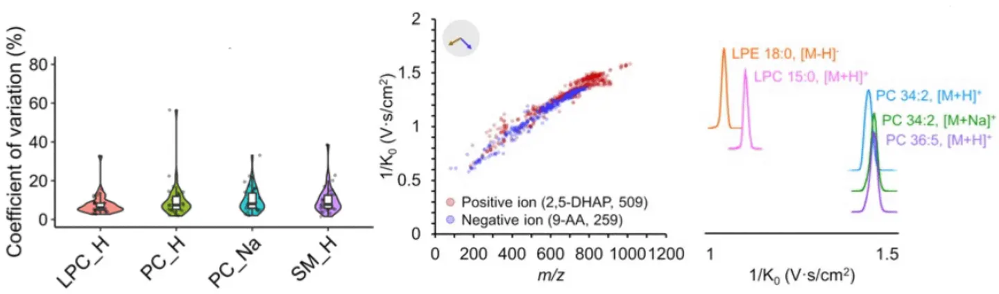 (B)IM分離技術を組み合わせたMALDI-MSで検出されたピークのm/zとイオン移動度の関係(陽イオンは赤、陰イオンは青)。右パネルは同重体(異性体および同位体脂質)の移動度プロファイルを示す。同重体をイオン移動度によって分離できている。