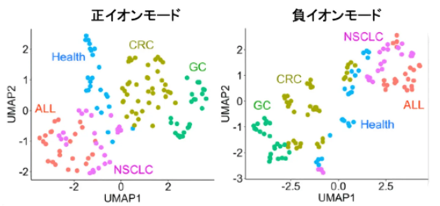 さらに本研究では、この超高速測定が実際の疾患の違いを捉えられるかを確かめるため、健常人と4種類のガン患者の血漿を解析しました。その結果、34検体という小規模ながら、データを圧縮表示するUMAP[用語8]と呼ばれる手法で、ガン種ごとの代謝物パターンの違いが明確に表れました(図2)。UMAPは高次元データを2次元に圧縮して表示する手法であるため、一部の検体では異なる群が近接して表示される場合もありますが、各患者由来のデータは全体として疾患ごとに異なる分布傾向を示していました。特に、ガン患者血漿で濃度が低下することが知られる「リゾホスファチジルコリン(LPC)」が、本研究のデータでも同様に低下しており、実臨床で見られる変化を正しく捉えられることが確認できました。