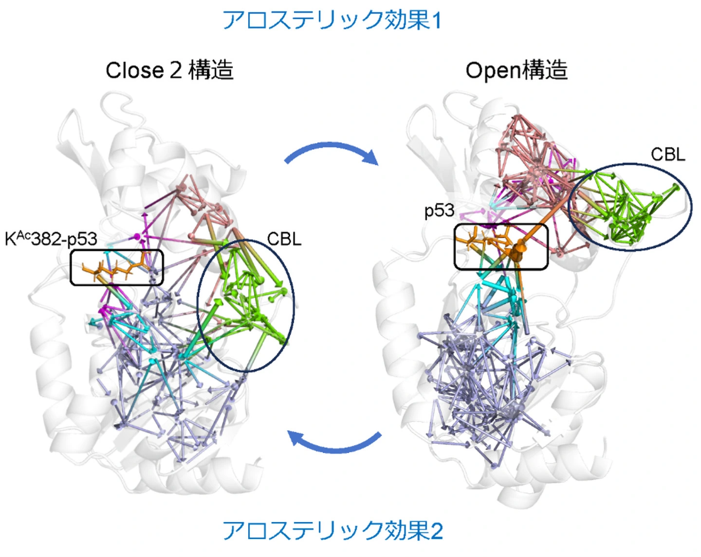左:基質KAc382-p53(オレンジ)からCBL(黄緑)に至りClose2構造からOpen構造への変化を導くアロステリック効果1と、右:生成物p53からCBLに至りOpen構造からClose2構造への変化を導くアロステリック効果2の情報伝達経路。
