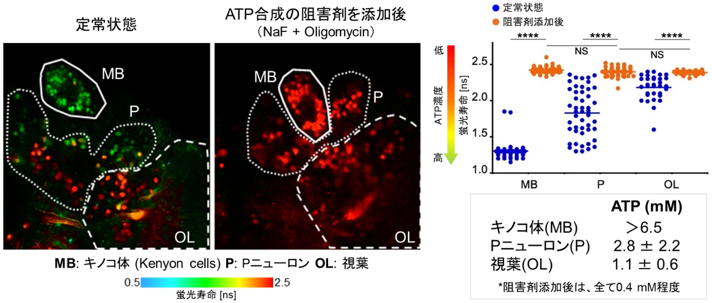 さらに、培養した細胞だけでなく、多細胞から構成されるショウジョウバエの脳におけるATP濃度分布の可視化にも成功しています(図3:金沢大学・木矢剛智准教授との共同研究)。