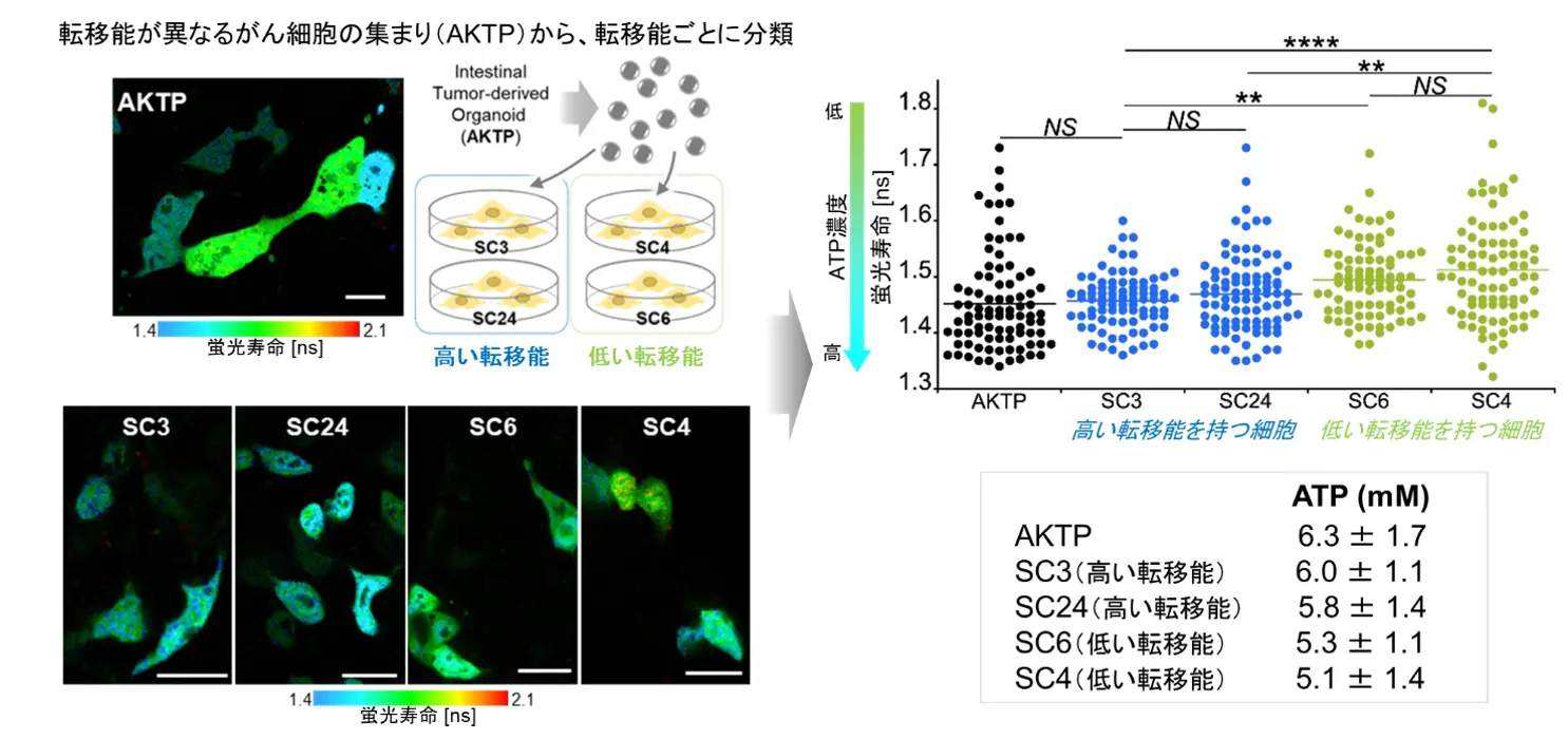 また、がん治療において、転移能の高いがん細胞は、悪性度が高いとされます。今回、金沢大学がん進展制御研究所との共同研究で、悪性度の高いがん細胞において細胞質のATP濃度が高いことが明らかとなりました(図2)。