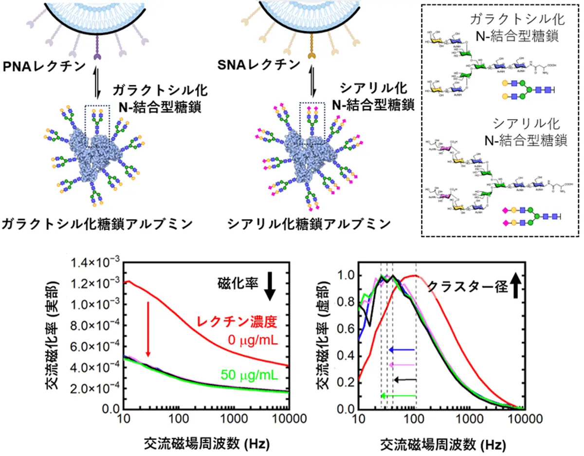 本研究では、磁性リポソーム表面上に固定したレクチンと、アスパラギン結合型糖タンパク質糖鎖(N-結合型糖鎖)[用語5]で修飾したアルブミン[用語6]との相互作用により形成されるクラスターの大きさを、交流磁化率から計測できることを示しました(図1)。生体内では、N-結合型糖鎖は多くの場合、生物活性を示すために細胞表面やタンパク質上にクラスターを形成しています。このように、生体内における「糖鎖の真の活性状態」であるクラスター形成による多価効果を高感度に検出できる点が、本磁性リポソーム型バイオセンサの利点です。