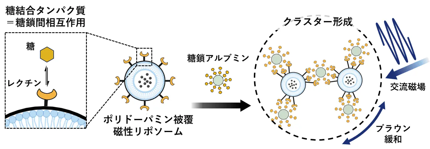 この技術は、超常磁性酸化鉄ナノ粒子を脂質膜で包み込んだ磁性リポソームの表面を、生体接着性の高いポリドーパミンでコーティングしたものです。交流磁場下におけるブラウン緩和[用語2]を利用することで、糖鎖[用語3]とレクチン[用語4]の相互作用を液体中で高感度に検出することが可能です。特に、多価性相互作用(複数の結合部位が同時に働くこと)によって、単一の糖との結合に比べて劇的に強いシグナルが得られることを実証しました。この技術は、医療診断、創薬、糖鎖生物学研究などへの幅広い応用が期待されます。