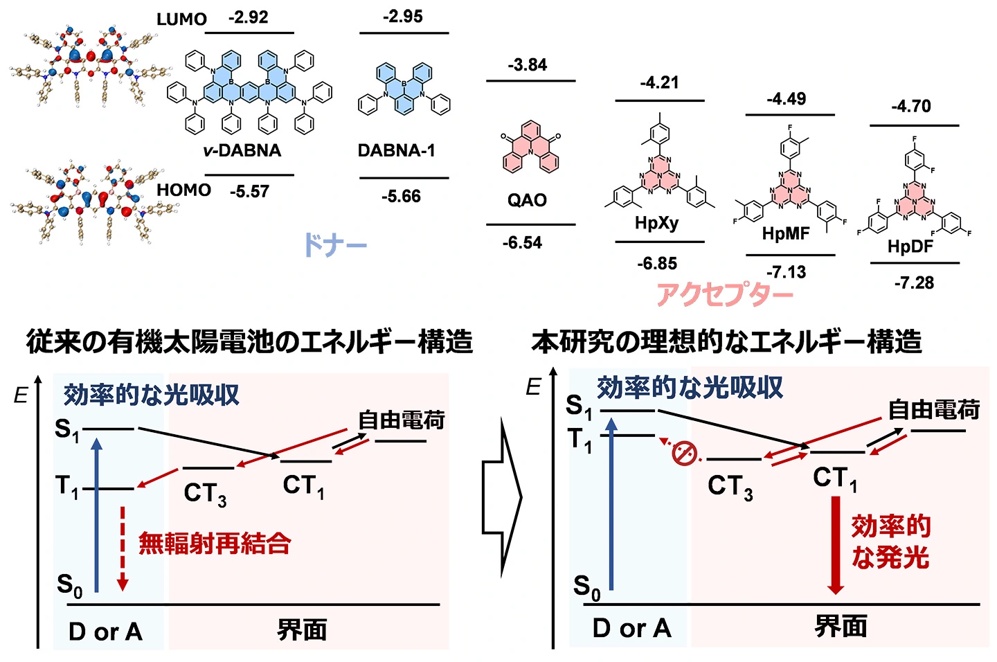 本研究では、有機EL分野で使われる2種類の発光分子を組み合わせることで、1つの素子内で光発電機能と発光機能を両立させることに成功しました。一般的に有機太陽電池の発光効率が0.1%以下と非常に低いのは、光発電分子として使われる電子ドナー・アクセプターどちらかの分子へエネルギー移動が起き、発光に至らない励起三重項状態(T1)が生成してしまうことが原因でした。そこで本研究では、有機EL分野で発光分子として利用される多重共鳴型熱活性化遅延蛍光分子(MR-TADF分子)[用語4]、図2中のν-DABNA、DABNA-1、QAO)や一重項–三重項逆転分子(IST分子)[用語5]、図2中のHpXy、HpMF、HpDF)[参考文献4]を用いることで、理想的なエネルギー構造を構築しました(図2)。これらの分子はT1が高い位置にあるため、界面エネルギー準位である電荷移動状態(CT状態)[用語6]よりもドナー・アクセプターのT1の方が高い状況をつくることができ、結果的に非発光性のT1へのエネルギー移動を抑制し、界面エネルギー準位からの発光を観測できるようになりました。