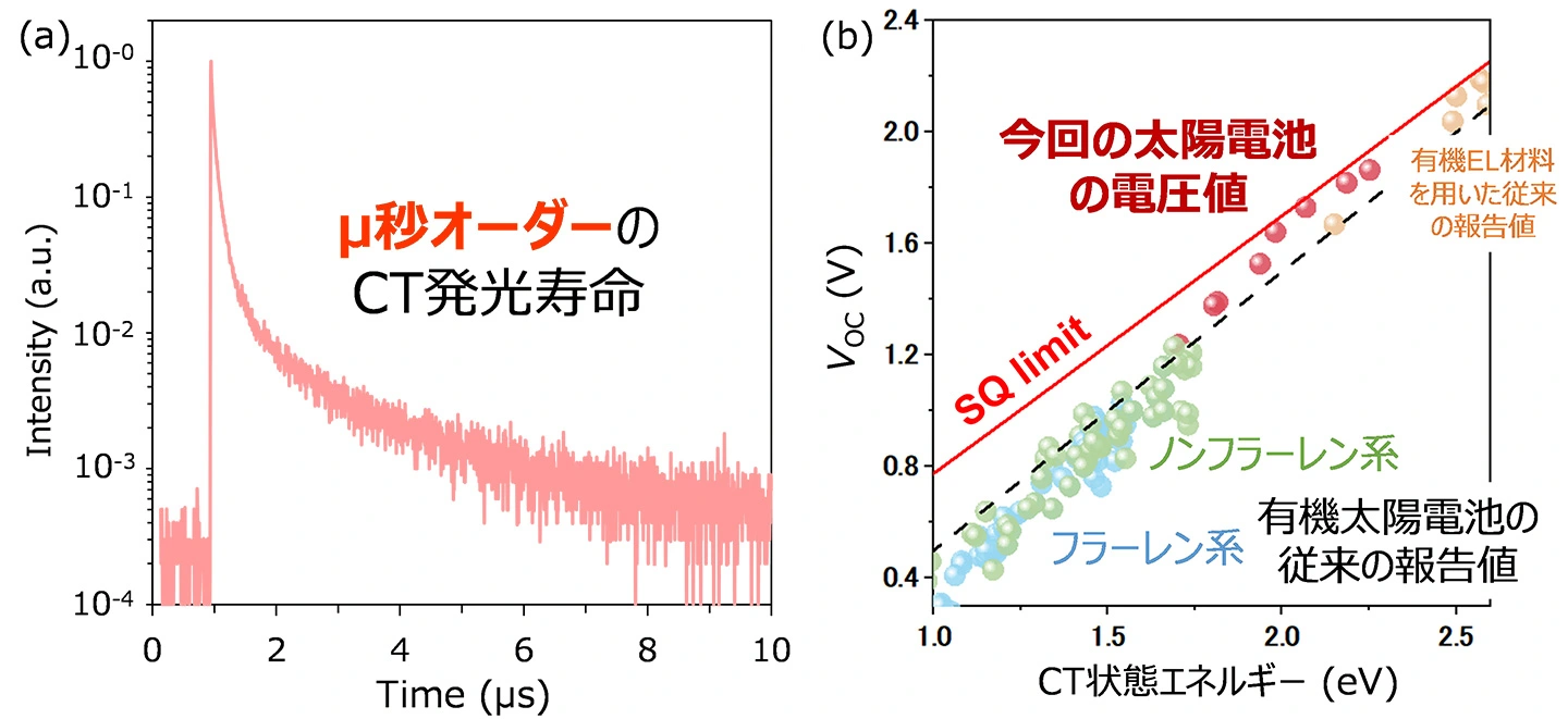 これらの分子の組み合わせが高い光発電効率と発光効率を両立できた要因を明らかにするために、CT発光[用語8]の過渡応答を評価したところ、発光寿命がµsオーダーに達する非常に緩やかな減衰挙動が確認されました(図4a)。ここから無輻射再結合速度を計算すると、一般的な有機太陽電池が示す値よりも100万倍程度遅いことが分かりました。つまり、今回MR-TADF分子やIST分子を用いたことにより、無輻射再結合が大幅に抑制されたことが分かりました。
