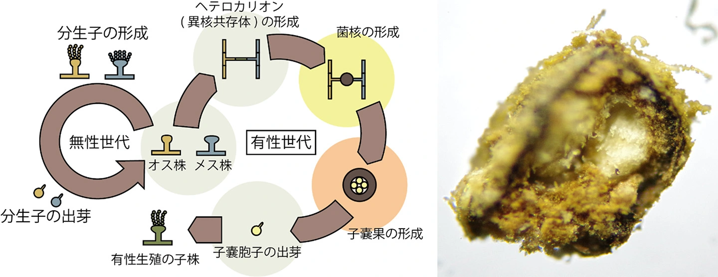 一方で、麹菌の近縁種であるAspergillus flavusやA. parasiticusでは、菌核内に有性生殖器官である子嚢果が形成され、有性生殖を行うことが知られています。さらに、A. oryzaeに「性遺伝子」の存在が示唆されたことから、A. oryzaeにも同様の有性生殖機構が存在する可能性が想定されたが、子嚢果の形成について明確な形態学的な証拠は示されていませんでした。