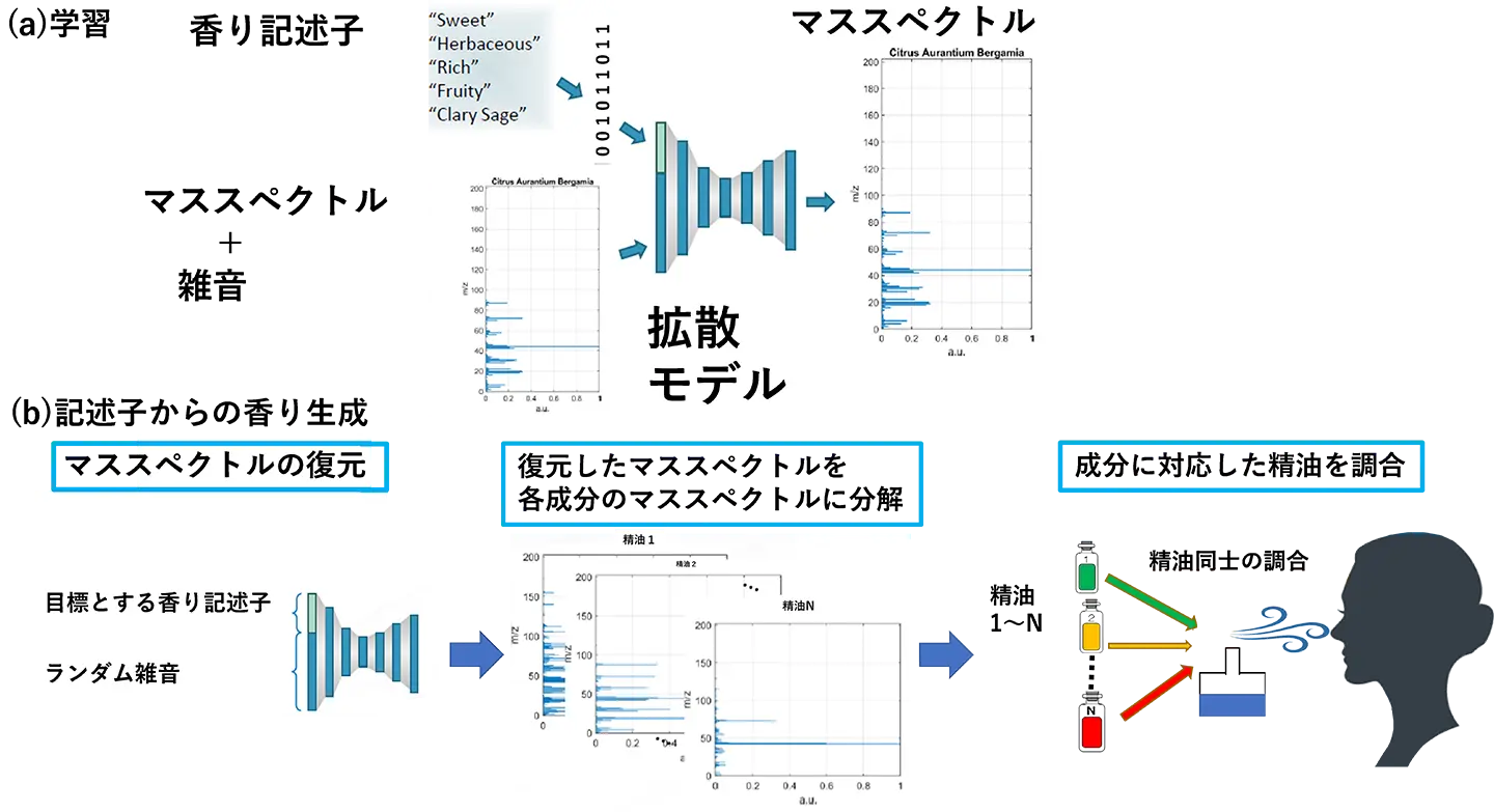 - 拡散モデルを使用して言語表現からマススペクトルを生成しスペクトルが一致するように香り成分を調合