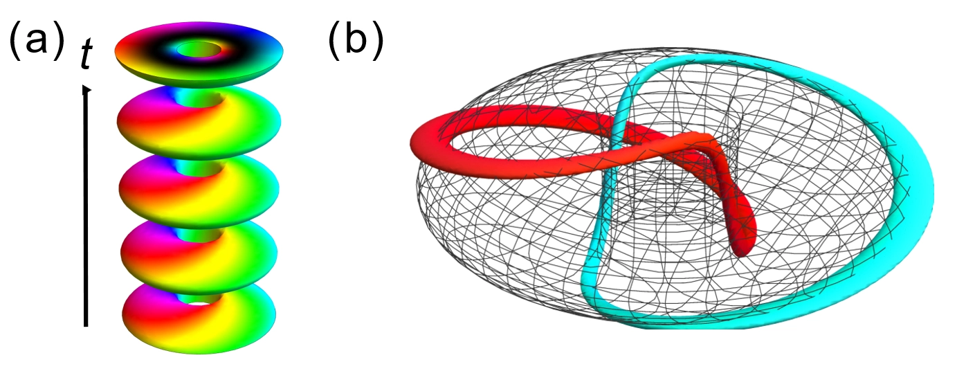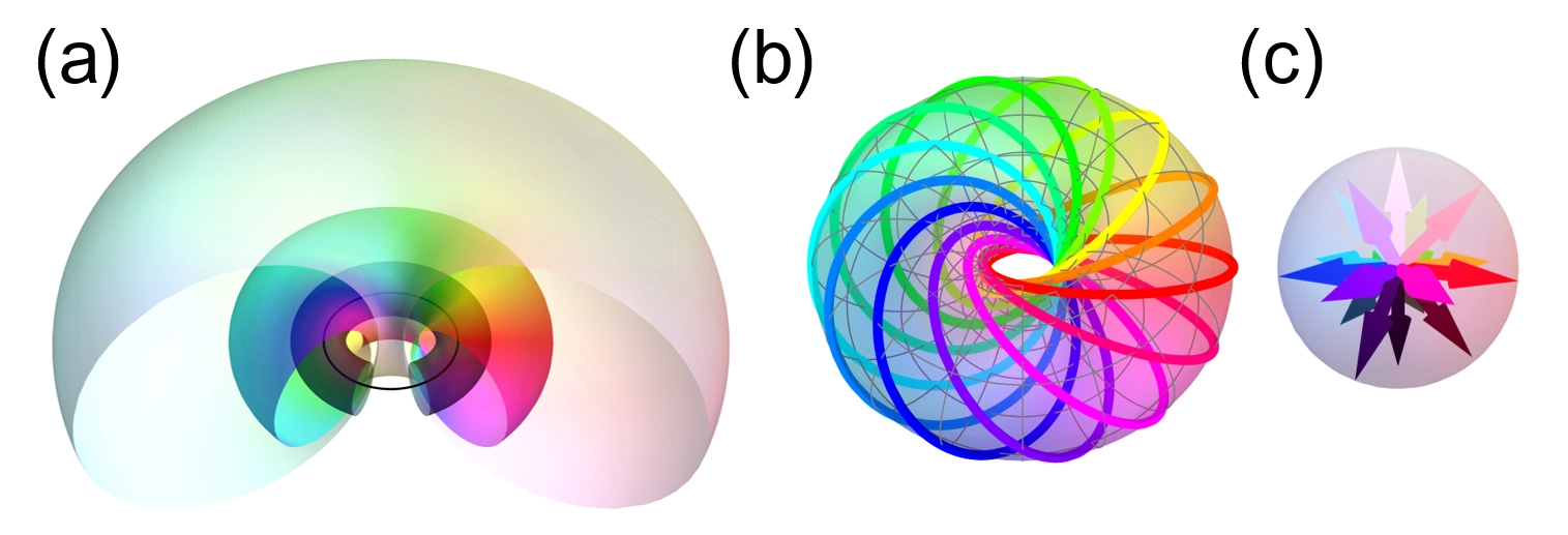 幾何学的な変化に対して不変な性質であるトポロジーは、自然科学の広い領域において重要な概念とされています。特に、粒子のように局在化したトポロジカルな構造は、多少の外乱では乱されず、堅牢に情報を保存し運ぶことのできる媒体として、次世代の情報処理や通信に利用する動きが活発化しています。近年では、2次元のスキルミオン[用語4]や、3次元のホプフィオン(図1)といったトポロジカルな構造が現実の物理状態として次々と発見されており、トポロジーを背景とした応用の道筋は整いつつあります。